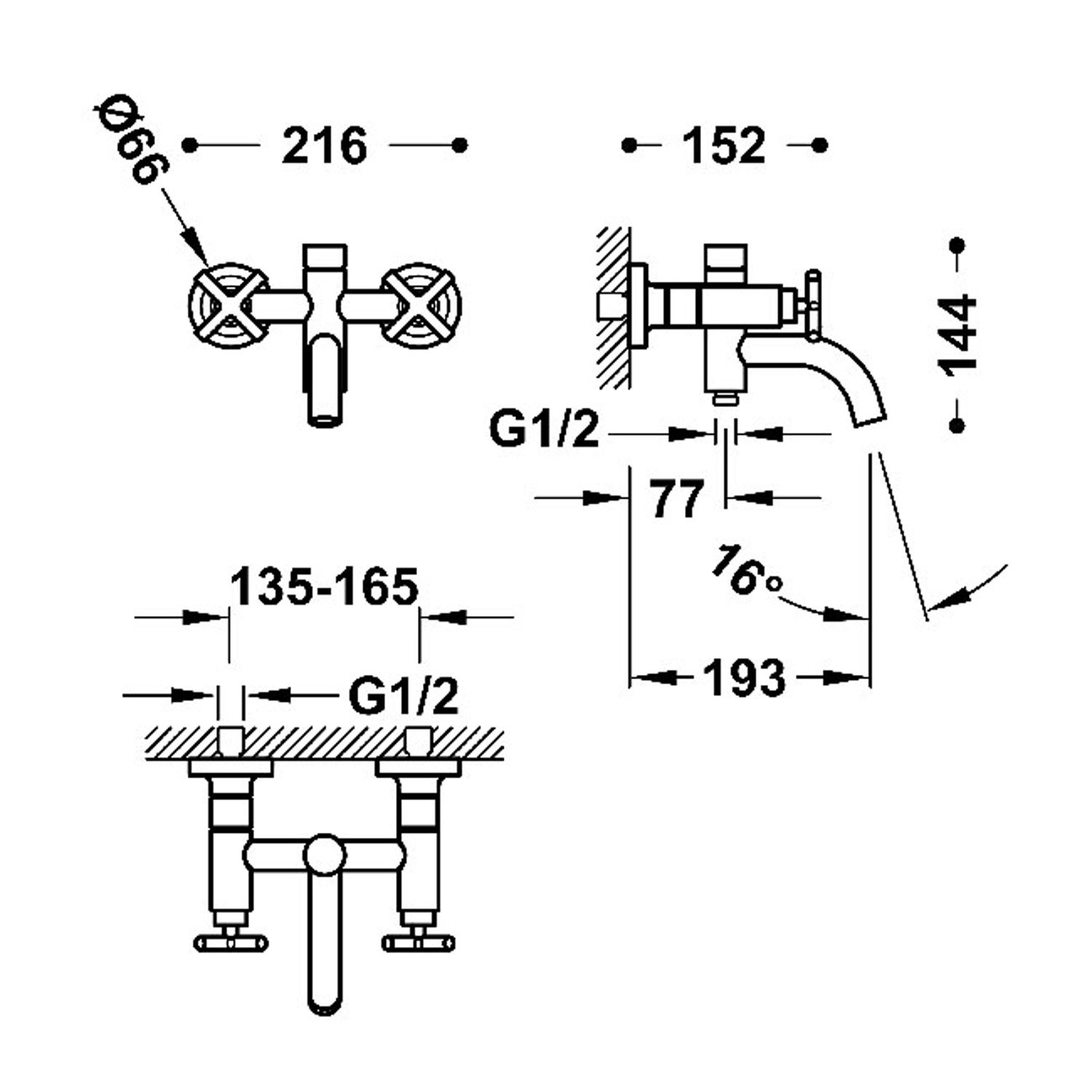 Omdat het een opbouwkraan is, is het te bevestigen aan de muur. De H.O.H. afstand om de kraan te bevestigen is verstelbaar en zit tussen de 13.5 en 16.5 cm. Om de gaten te bedekken komt de kraan inclusief rozetten. Deze hebben een afmeting van 6.6 cm doorsnede.