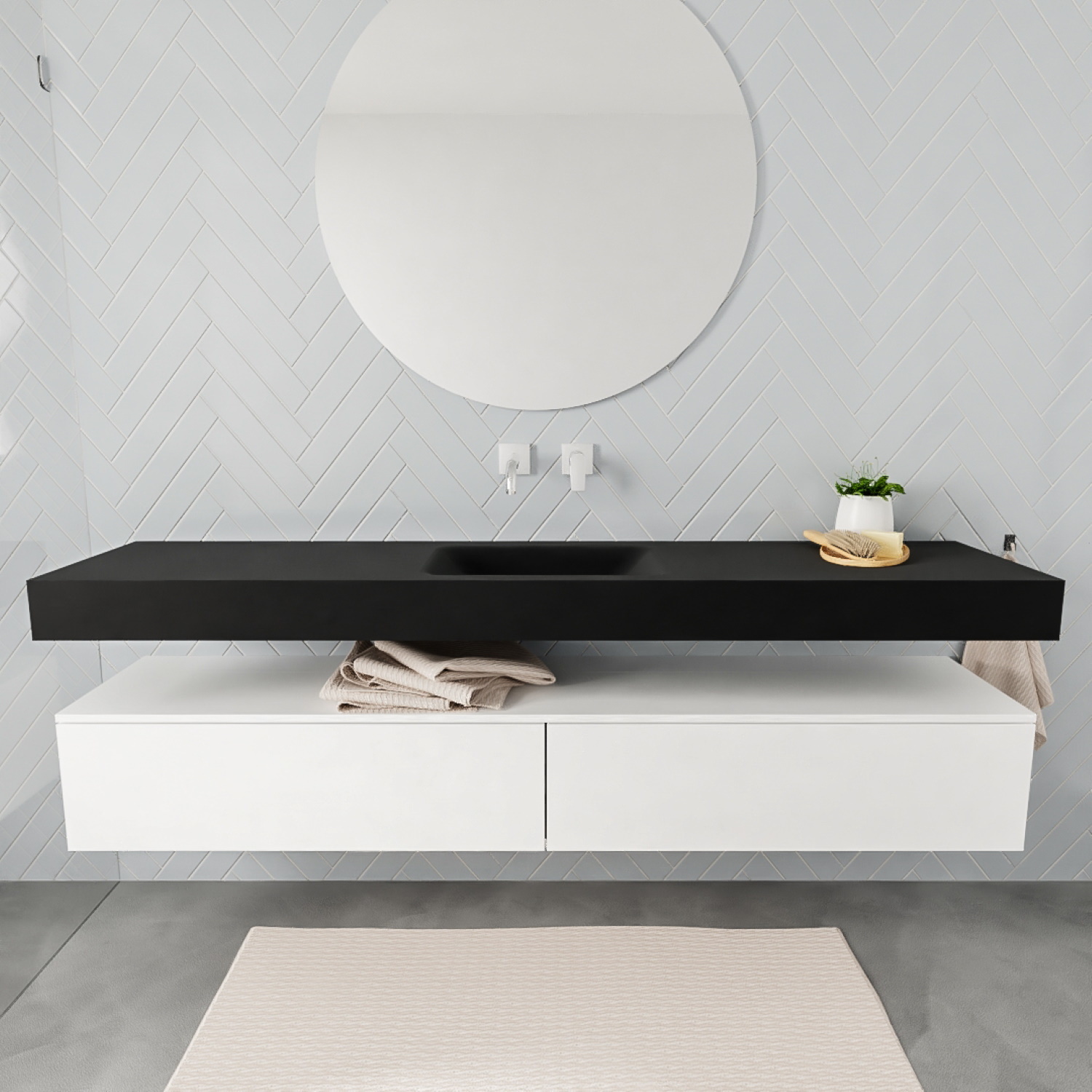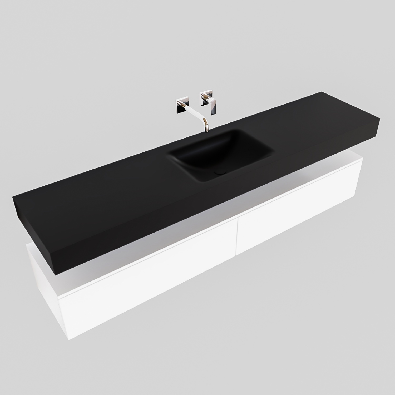 De bijpassende onderkast heeft een afwerking in de kleur mat wit, terwijl de wastafel een mat zwarte kleur heeft. De onderkast beschikt over twee soft-close lades waarin u diverse badkamerartikelen kunt bewaren. Het betreffen lades die greeploos zijn waardoor deze onderkast een zeer strak en modern design heeft. Dit badmeubel is leverbaar in acht verschillende varianten. U kunt ervoor kiezen om de spoelbak links, in het midden of aan de rechterkant van het meubel te hebben. Ook is deze wastafel leverbaar in een variant met twee spoelbakken. De wastafel is uitgerust zonder of met kraangat, terwijl u bij de dubbele wastafel de keuze heeft uit nul of twee kraangaten.