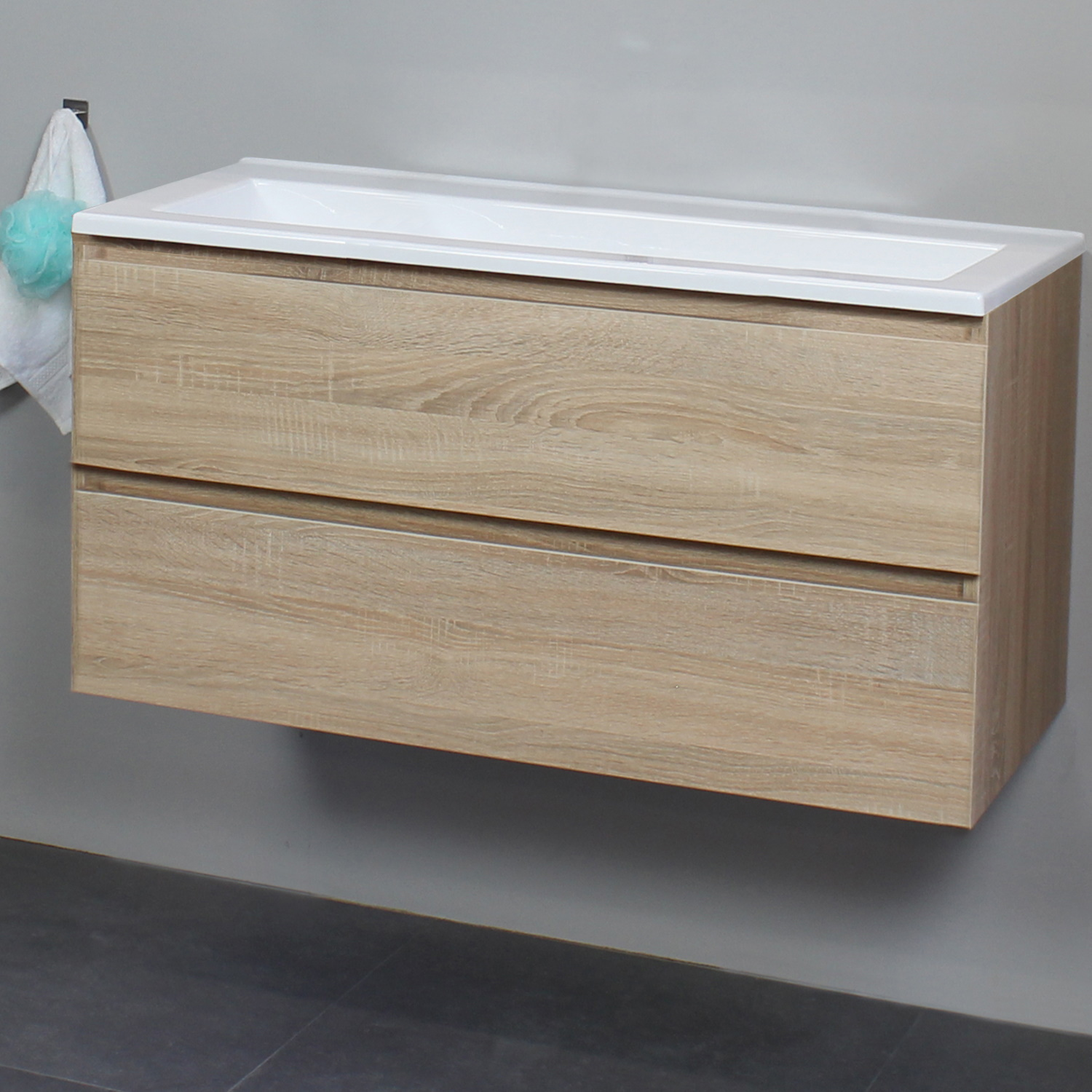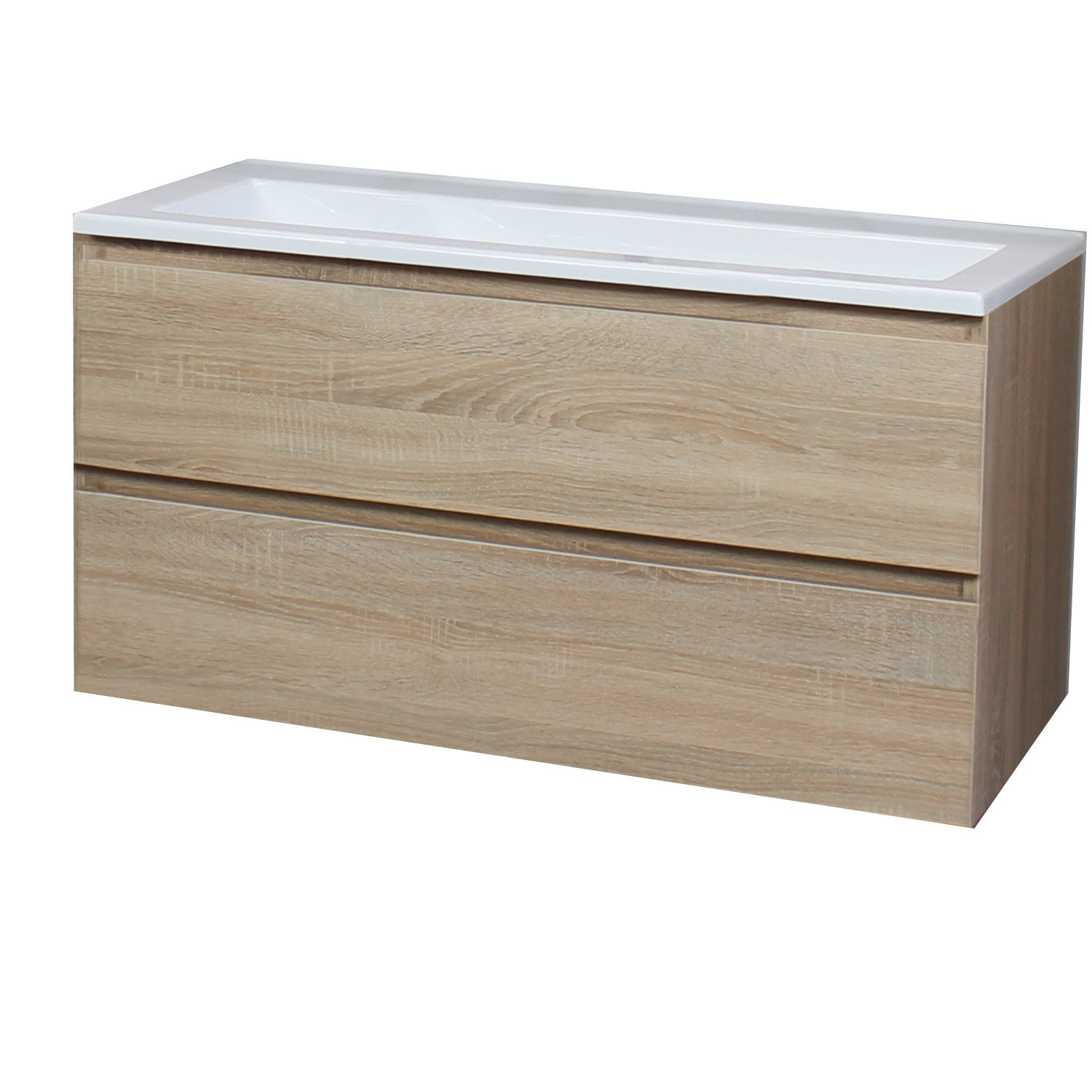 Dit prachtige badmeubel van Boss & Wessing, beschikt over een eiken kleurige onderkast met een wastafel van acryl. De wastafel wordt geleverd zonder kraangat, maar wilt u toch beschikken over een kraan, kunt u kiezen voor de aanschaf van een inbouw kraan. Het badmeubel heeft een breedte van 100 cm, een hoogte van 55 cm en een diepte van 46 cm. De set is in meerdere afmetingen en verschillende kleuren beschikbaar.