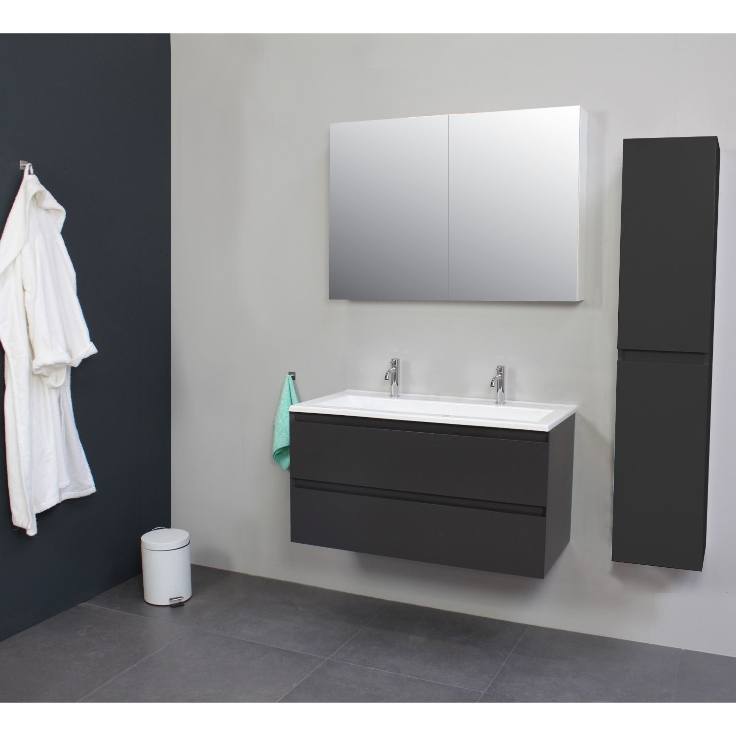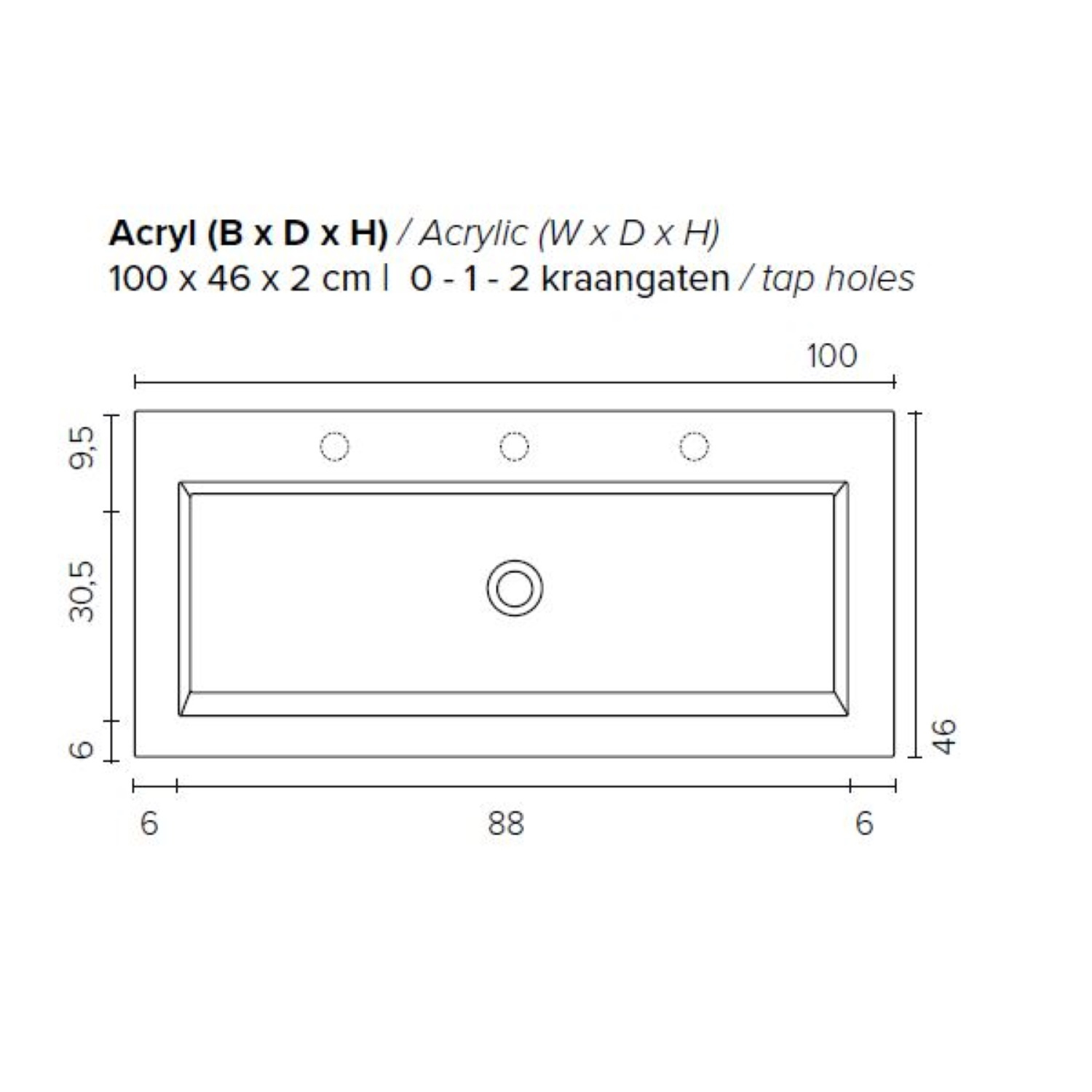 Het badmeubel heeft een breedte van 100 cm, een hoogte van 55 cm en een diepte van 46 cm. De set is verkrijgbaar in meerdere afmetingen en kleuren.
