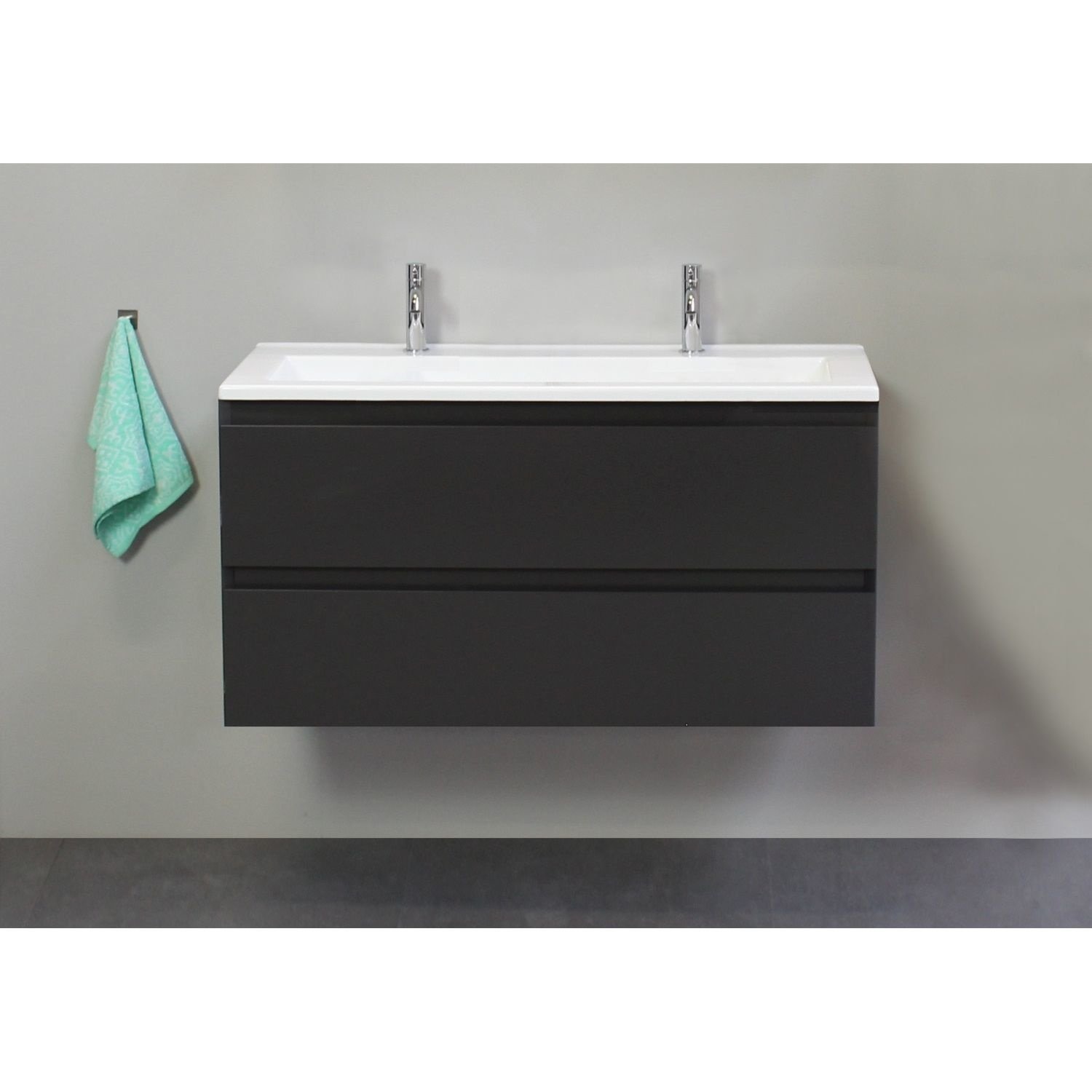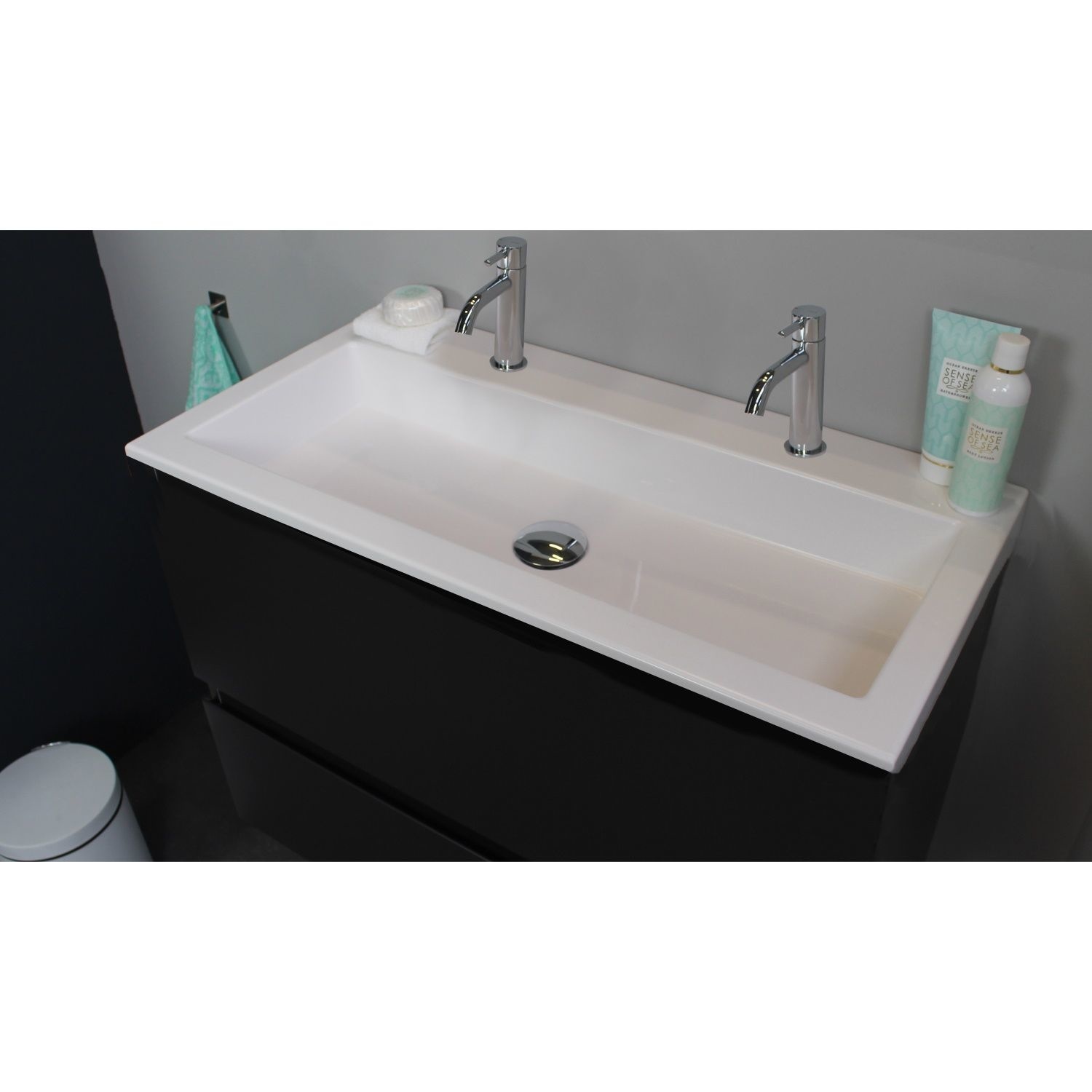 Het badkamermeubel van Boss & Wessing bestaat uit een onderkast en een brede wastafel die beschikt over 2 kraangaten. De onderkast is gemaakt van melamine en heeft 2 greeploze soft close lades, handig om al uw badkamer spullen in op te bergen. De onderkast heeft een antracieten kleur. De wastafel is van acryl en wordt geleverd in een witte kleur. Omdat de wastafel beschikt over 2 kraangaten heeft u de optie om een opbouwkranen toe te voegen aan uw wastafel (tegen een meerprijs). Doordat de wastafel beschikt over 2 kraangaten, hoeft u niet op uw beurt te wachten en kunt gemakkelijk tegelijk uw handen wassen.