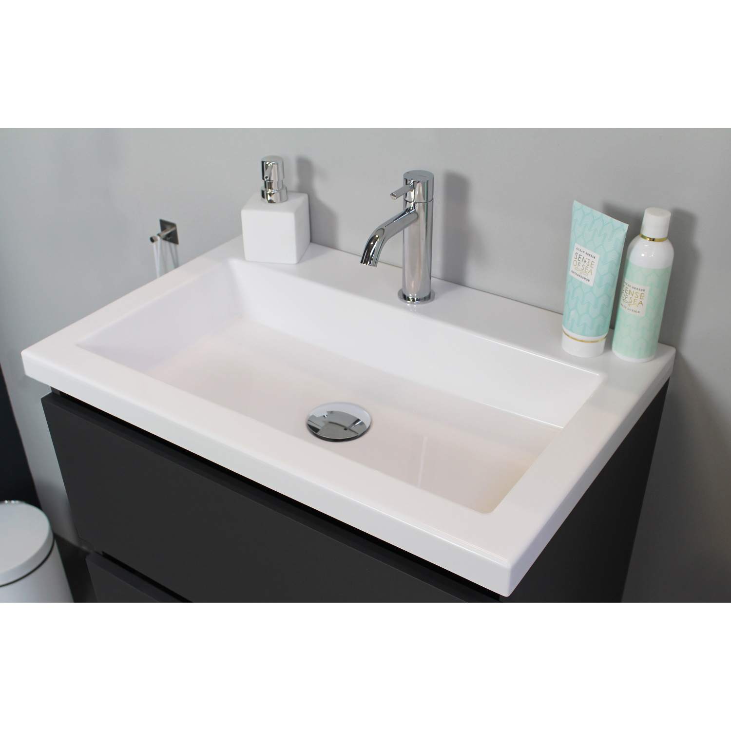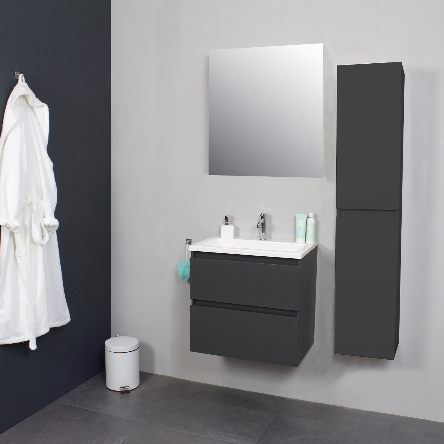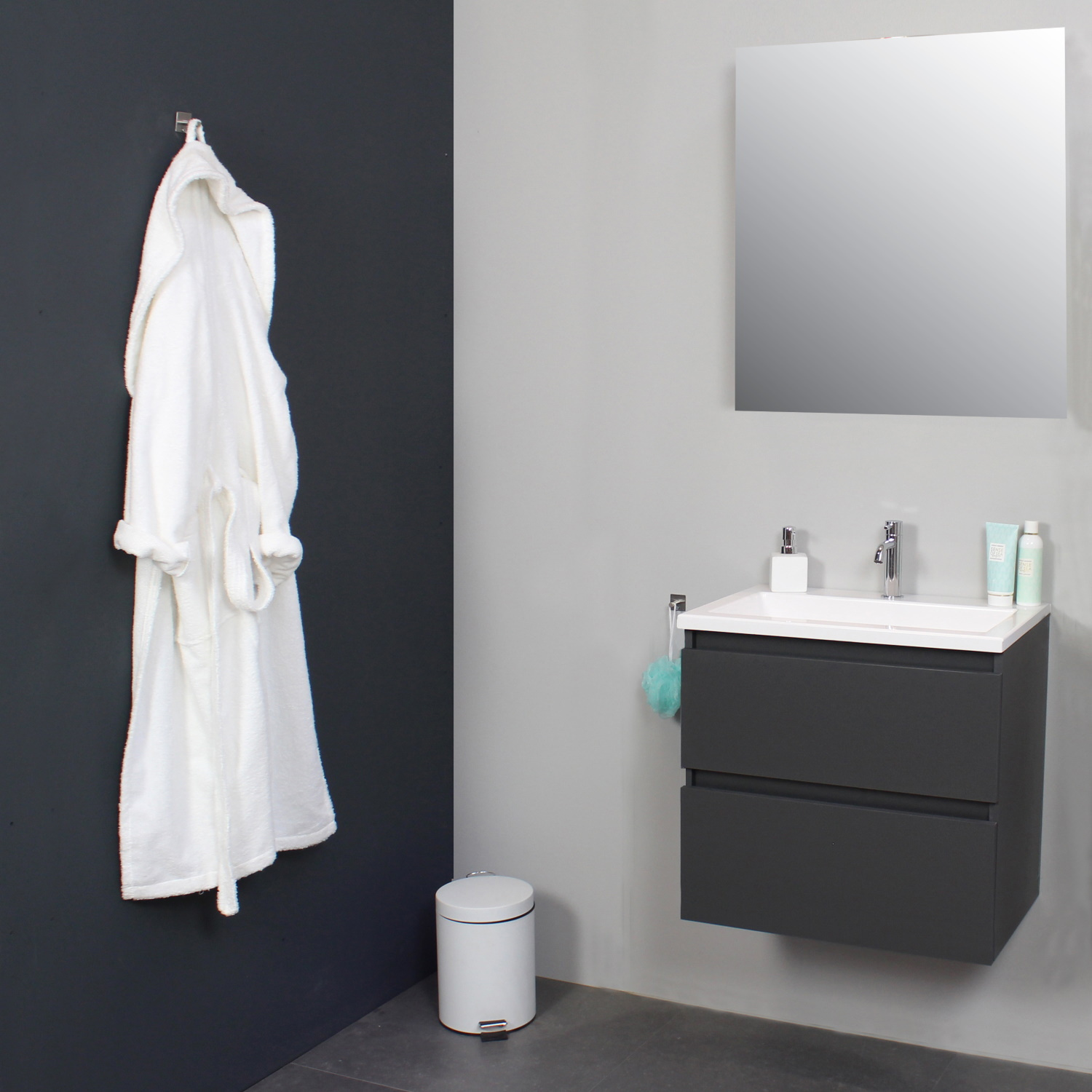 Dit prachtige badmeubel van Boss & Wessing, beschikt over een antraciet kleurige onderkast met een wastafel van acryl. De wastafel wordt geleverd met 1 kraangat, dus heeft u de optie om een opbouwkraan toe te voegen aan uw wastafel. Het badmeubel wordt geleverd inclusief spiegel. De afmetingen van het badmeubel zijn: breedte 60 cm, hoogte 55 cm en een diepte van 46 cm. De set is in meerdere afmetingen en verschillende kleuren beschikbaar.