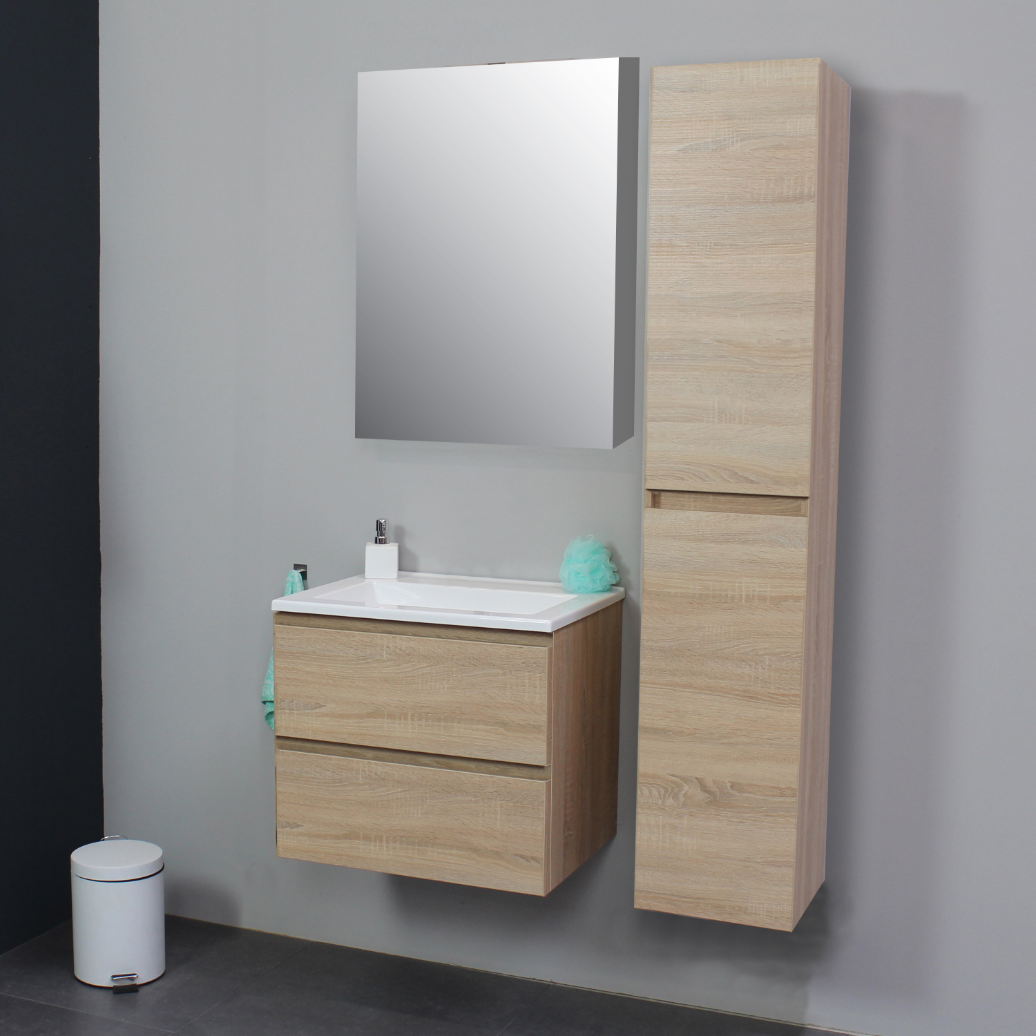 Dit prachtige badmeubel van Boss & Wessing beschikt over een eiken hout kleurige onderkast met een wastafel die gemaakt is van acryl. Het badmeubel past met het moderne design bijna in iedere badkamer. De wastafel wordt geleverd zonder kraangat, waardoor u dus de keuze heeft om een inbouwkraan aan te sluiten op het badmeubel. Neem een kijkje op de website voor het ruime aanbod aan inbouw kranen. Het badmeubel wordt daarnaast geleverd inclusief grijze spiegel kast, waar u gemakkelijk uw badkamer artikelen in op kunt bergen.