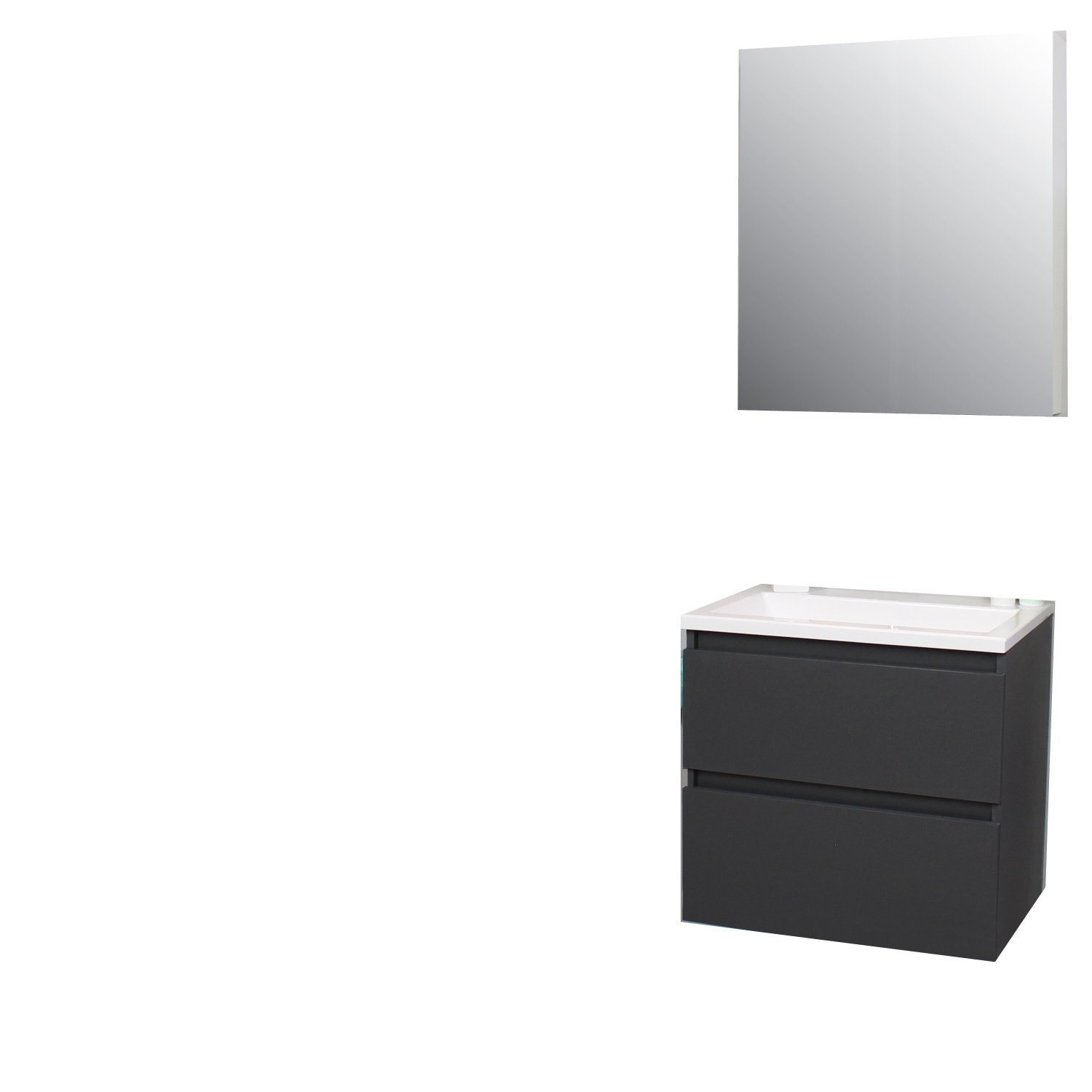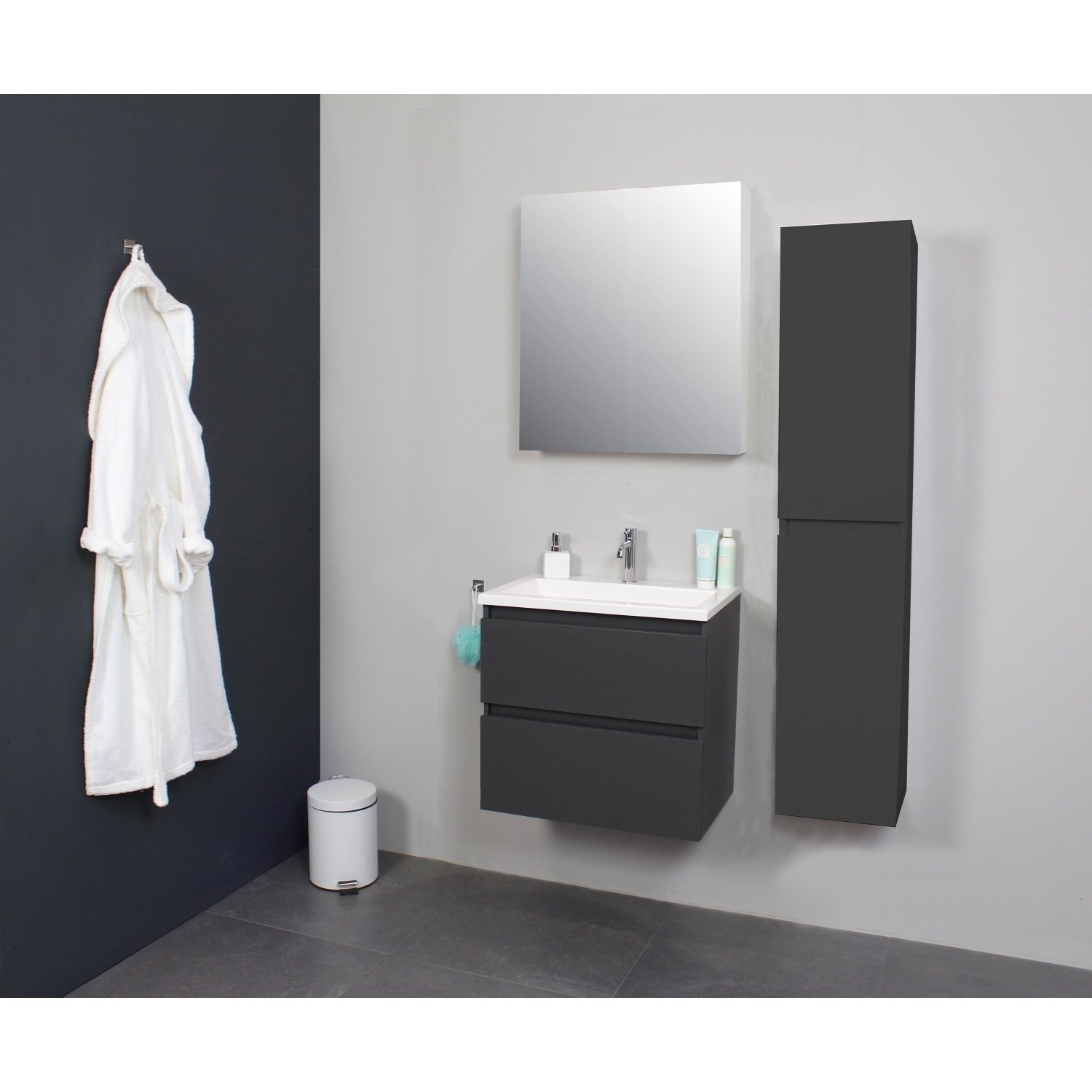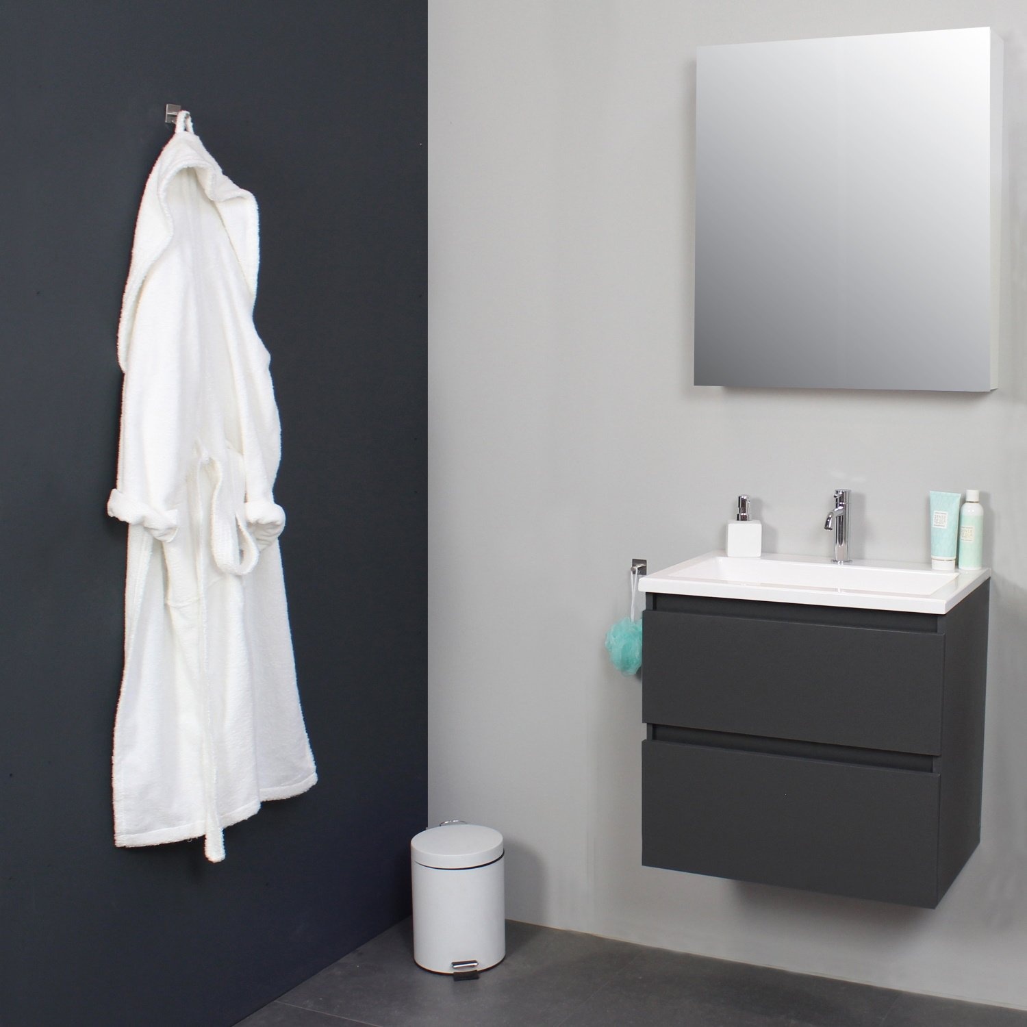 Dit prachtige badmeubel van Boss & Wessing beschikt over een antraciet kleurige onderkast met een wastafel die gemaakt is van acryl. Het badmeubel past met het moderne design bijna in iedere badkamer. De wastafel wordt geleverd met een kraangat, waardoor u dus de keuze heeft om een opbouwkraan aan te sluiten op het badmeubel. Neem een kijkje op de website voor het ruime aanbod aan opbouw kranen. Het badmeubel wordt daarnaast geleverd inclusief grijze spiegel kast, waar u gemakkelijk uw badkamer artikelen in op kunt bergen.