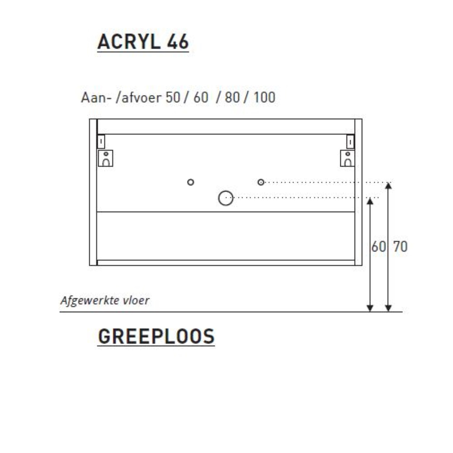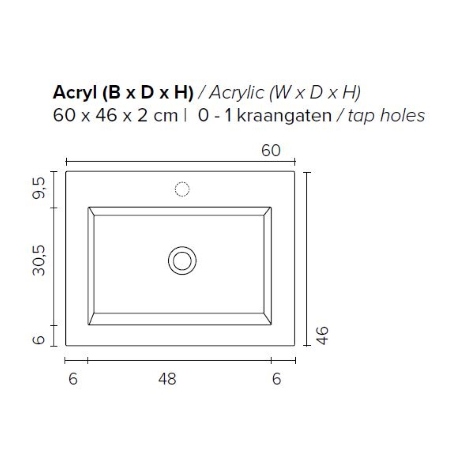 De afmetingen van het badmeubel zijn: 60 cm in de breedte, 55 cm in de hoogte en 46 cm diepte.