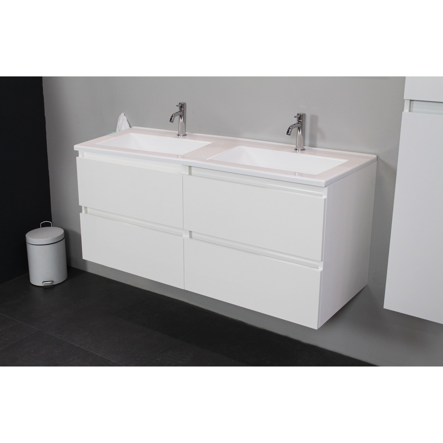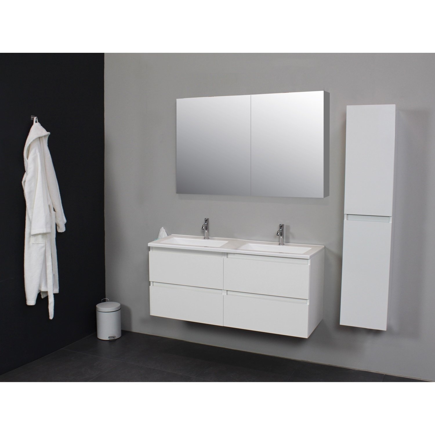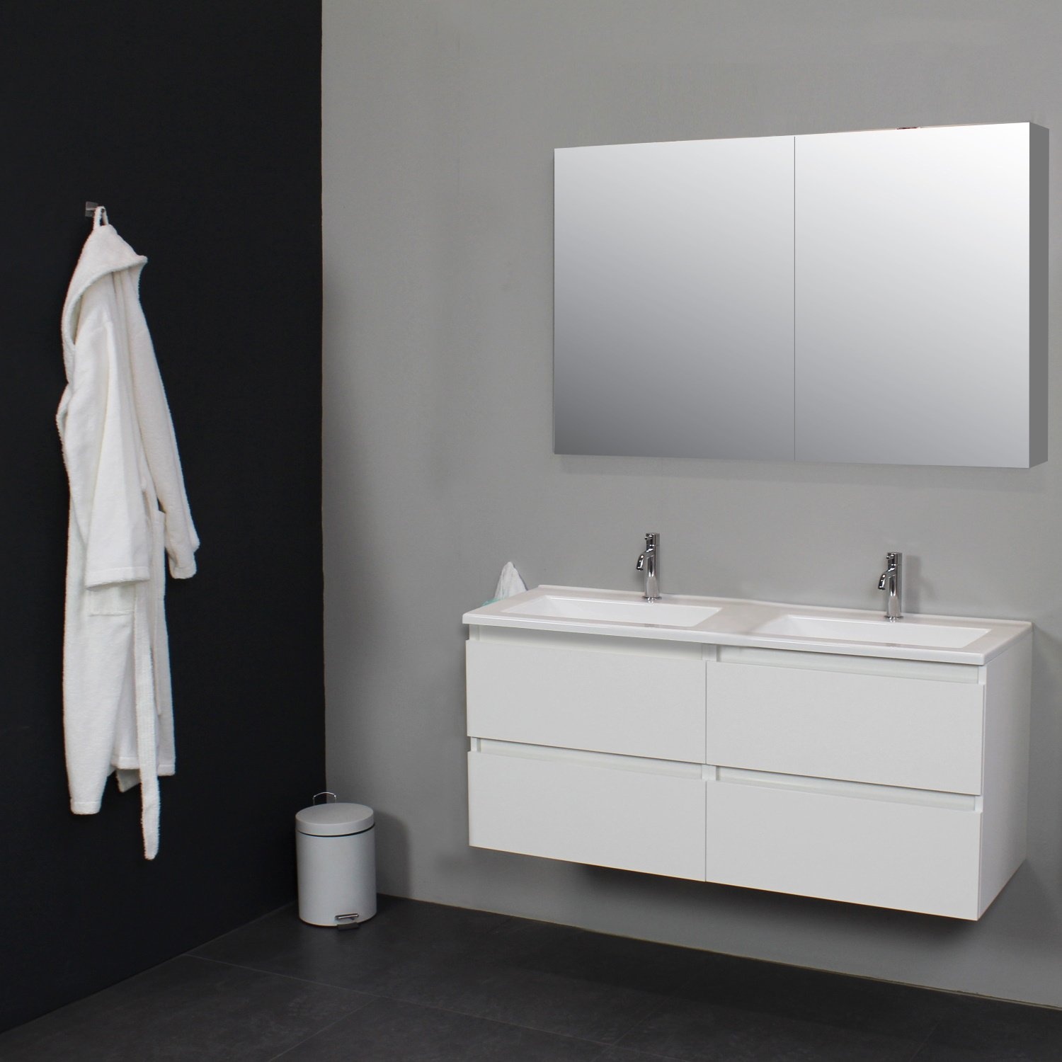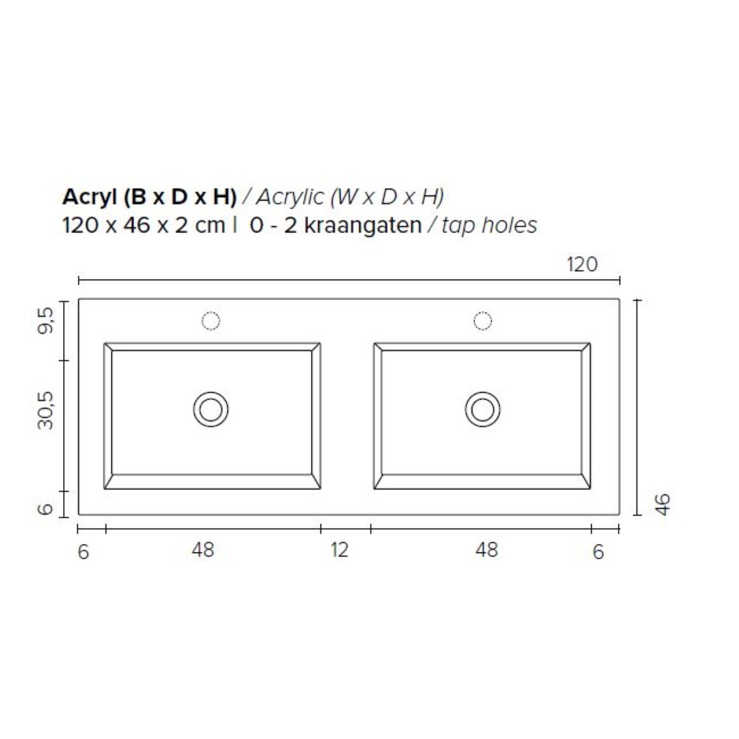 De afmetingen van het badmeubel zijn: 120 cm in de breedte, 55 cm in de hoogte en 46 cm diepte.