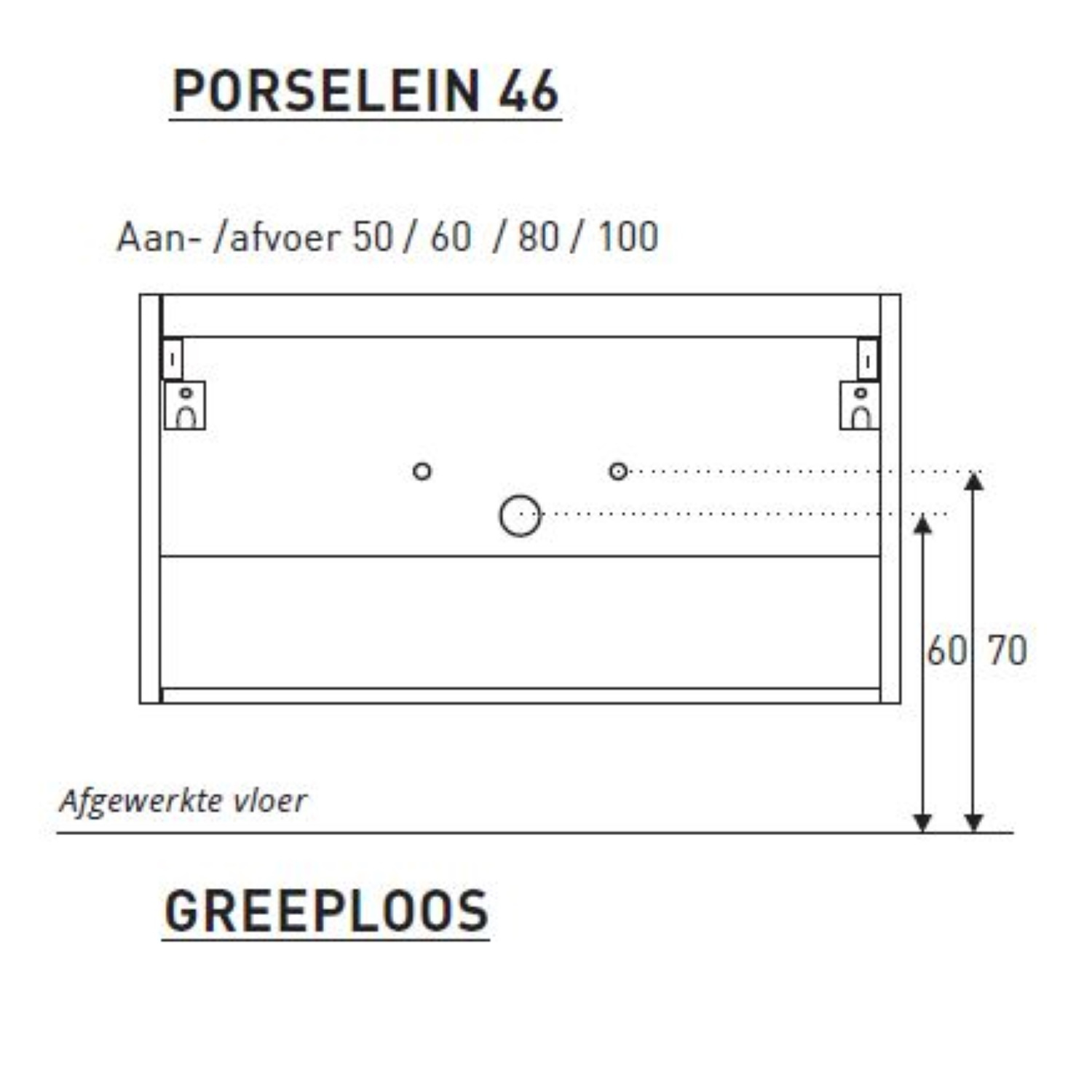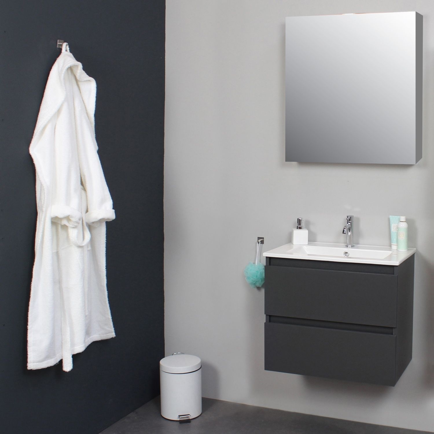 De afmetingen van het badmeubel zijn: 60 cm in de breedte, 55 cm in de hoogte en 46 cm diepte.