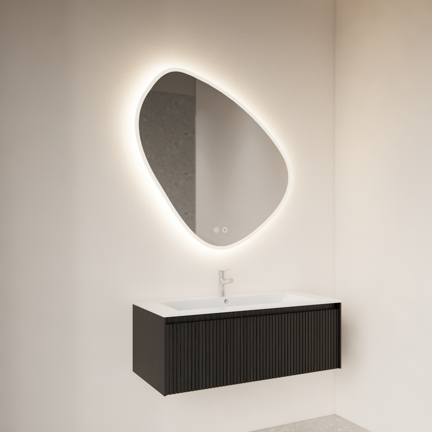 De verlichting is in 3 kleuren led van 2000 t/m 6000 Kelvin en dimbaar. De verlichting is in 3 kleuren led van 2000 t/m 10000 Kelvin en dimbaar. De spiegel is dimbaar in de tinten 3000k,42000 K en 6500 K. We raden 3000 Kelvin aan als u een ontspannen sfeer in de badkamer wilt creëeren. Wilt u beter zicht hebben dan is 4200 of 6500 Kelvin vaak prettiger om mee te werken. Dit zijn wat koelere en wittere kleuren dan 3000K. De spiegel is 80 cm breed, heeft een hoogte van 80 cm en een glasdikte van 4 mm. Verder bevat de spiegel 2touch knoppen waarmee u de verlichting en verwarming eenvoudig kunt bedienen. De spiegel is voorzien van geintegreerde spiegelverwarming, deze is met de tweede touch knop te bedienen. Wanneer de verlichting is uitgeschakeld, licht de touch button blauw op.