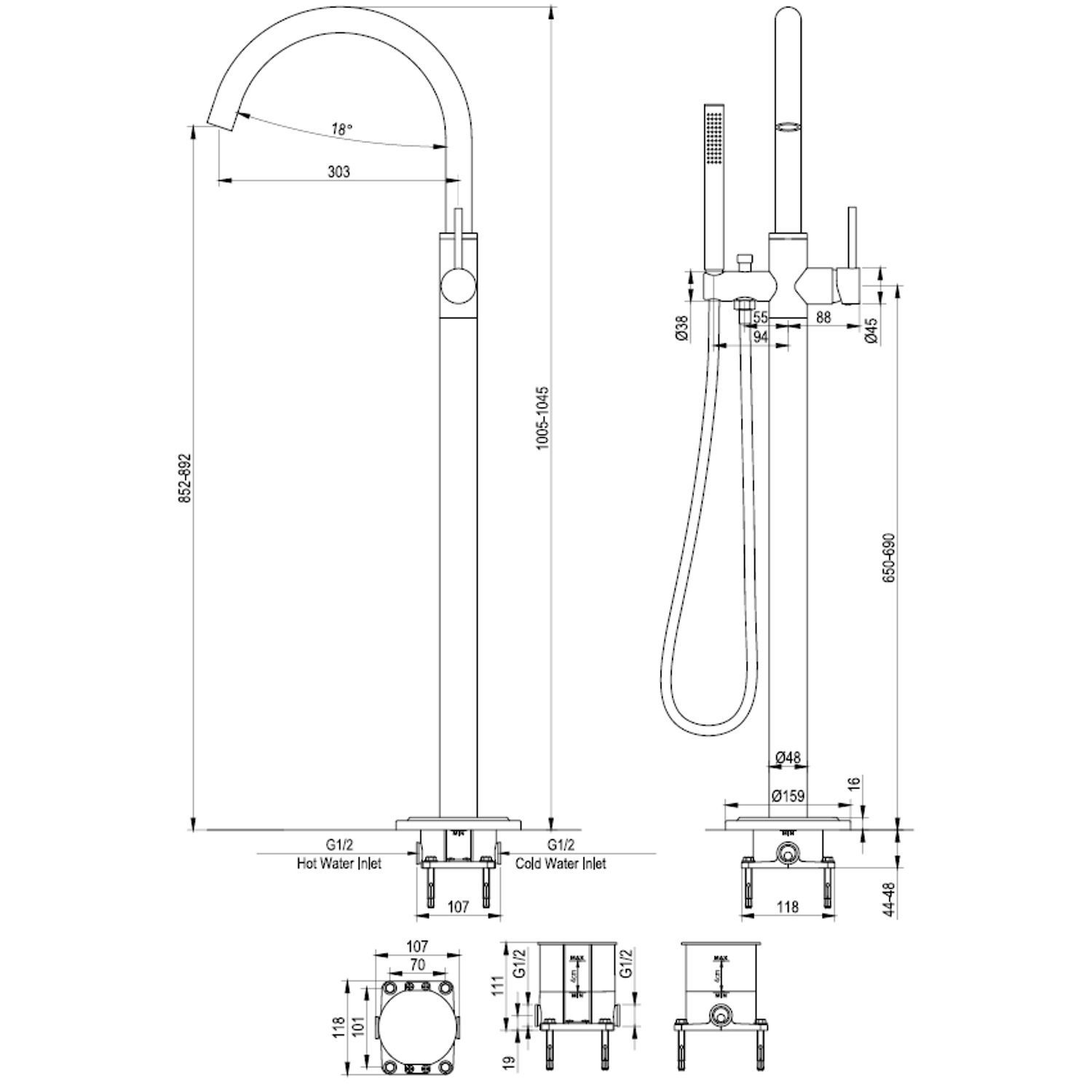 Deze badkraan met handdouche geeft uw badkamer een luxueuze en moderne touch. De uitloop is zwenkbaar. De kraan is van messing in de kleur geborsteld goud. Hij is tussen de 100,5 en 104,5 cm hoog. De uitloop is 30,3 cm lang.