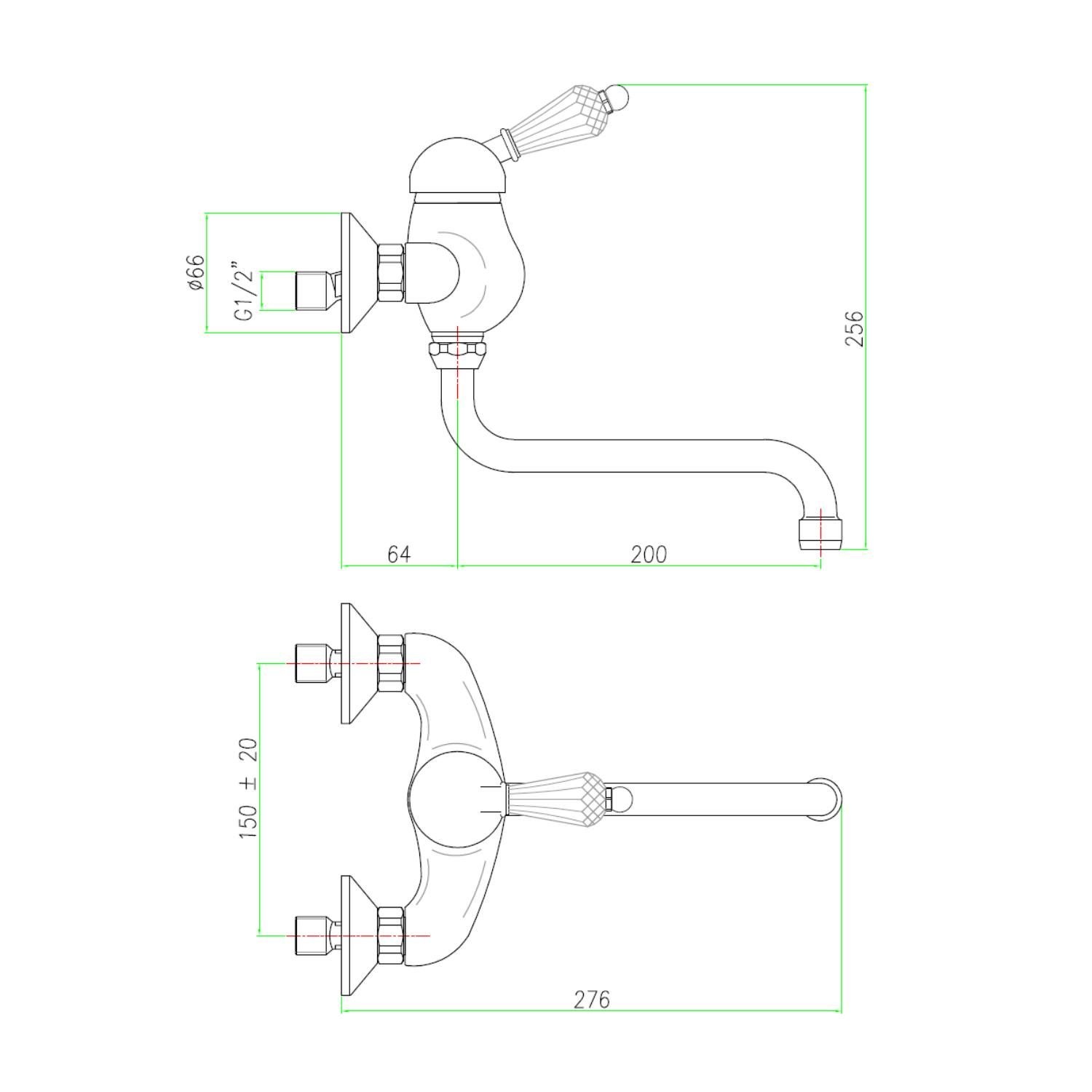 De sierlijke uitloop heeft een lengte van 20 cm. De badkraan dient aan de wand bevestigd te worden. De hart-op-hart afstand van dit artikel bedraagt 15 cm, met een speling van 2 cm.