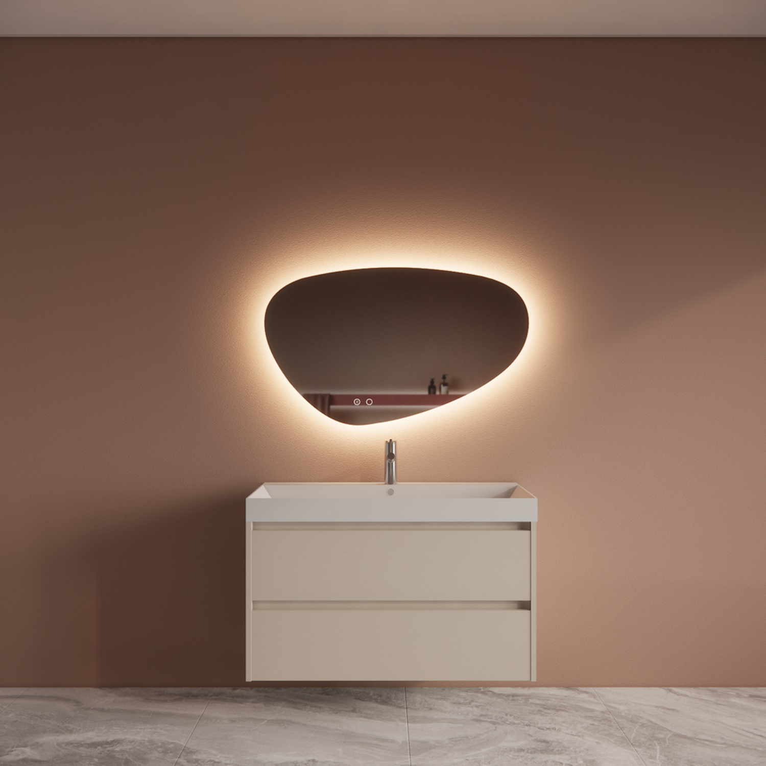 Deze set wordt standaard geleverd zonder spiegel. Hierdoor kunt u zelf kiezen wat voor maat en vorm spiegel u bij de set plaatsen wilt. Echter hebben wij 3 opties toegevoegd die u tegen bijbetaling kunt mee bestellen mocht u er niet uit komen.