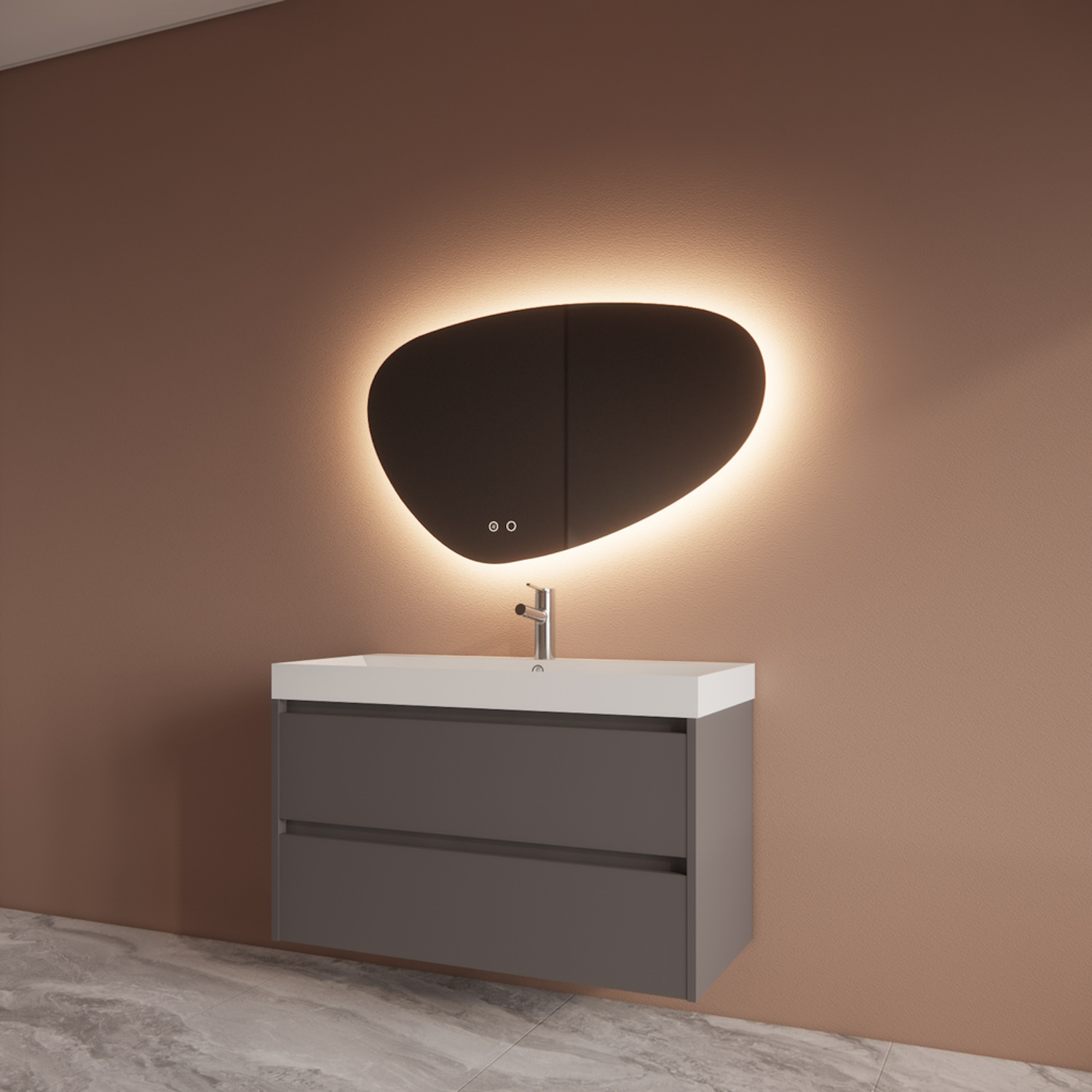 De onderkast van het meubel is gemaakt van 18 mm Melamine plaat (FSC Gekeurd). De twee lades van dit badkamermeubel zijn uitgevoerd met een soft-close techniek. Dit houd in dat wanneer de lade wordt gesloten, deze automatisch wordt afgeremd en zelf automatisch rustig sluit. Deze onderkast wordt voorgemonteerd geleverd.