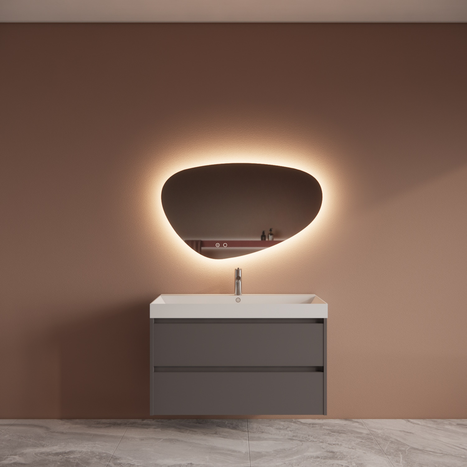 Deze set wordt standaard geleverd zonder spiegel. Hierdoor kunt u zelf kiezen wat voor maat en vorm spiegel u bij de set plaatsen wilt. Echter hebben wij 3 opties toegevoegd die u tegen bijbetaling kunt mee bestellen mocht u er niet uit komen.