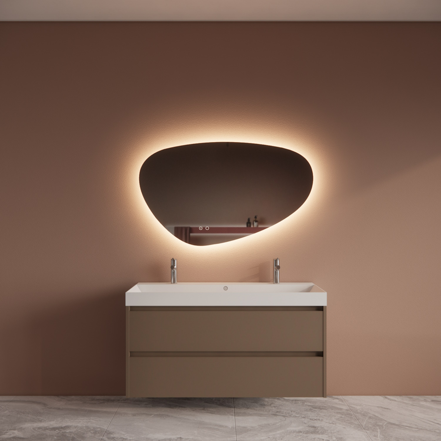 Deze set wordt standaard geleverd zonder spiegel. Hierdoor kunt u zelf kiezen wat voor maat en vorm spiegel u bij de set plaatsen wilt. Echter hebben wij 3 opties toegevoegd die u tegen bijbetaling kunt mee bestellen mocht u er niet uit komen.