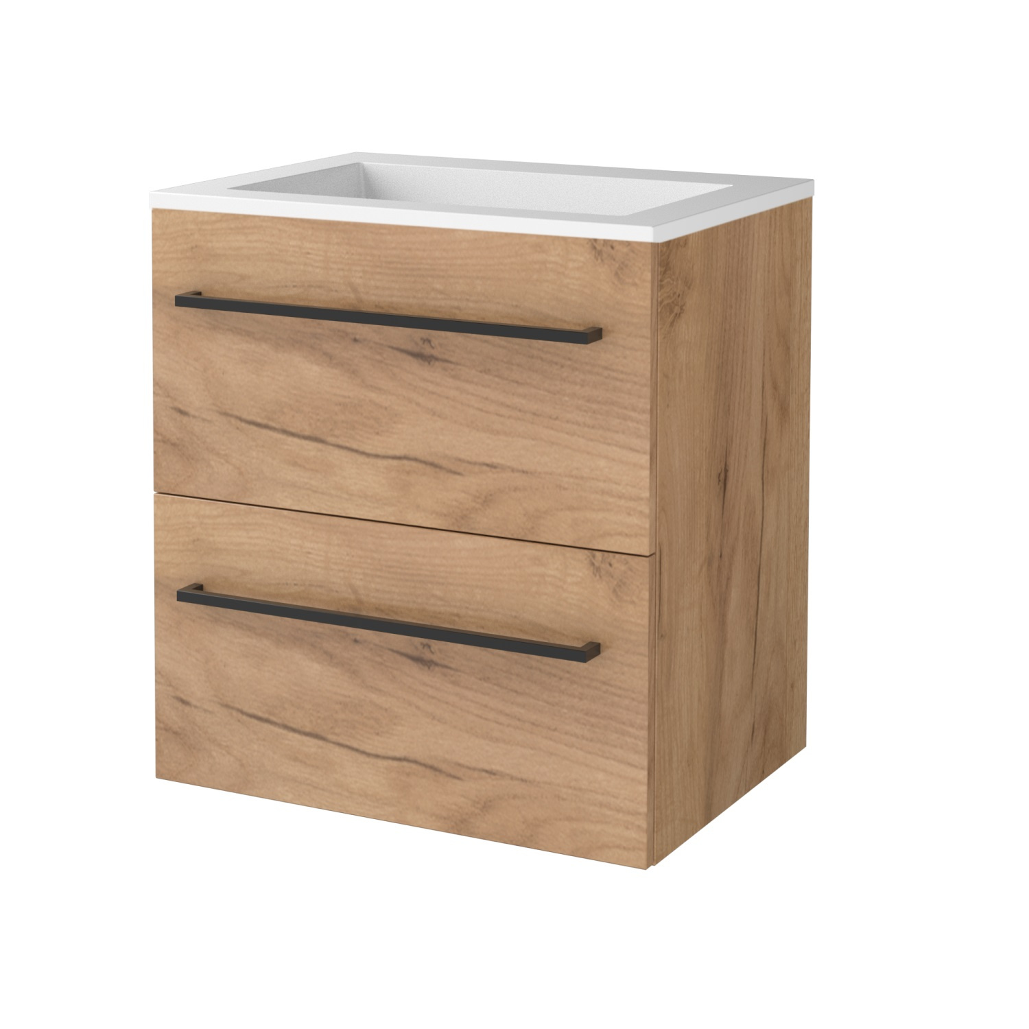 Deze mooie badmeubelset van Aquasplash komt uit de serie Salt, hij is gemaakt van Melamine in de kleur Whisky Oak. De hoogte van dit meubel is 65 cm, de breedte van dit meubel is 60 cm en de diepte is 46 cm. De wastafel die in deze set zit is gemaakt van Acryl in een witte kleur.