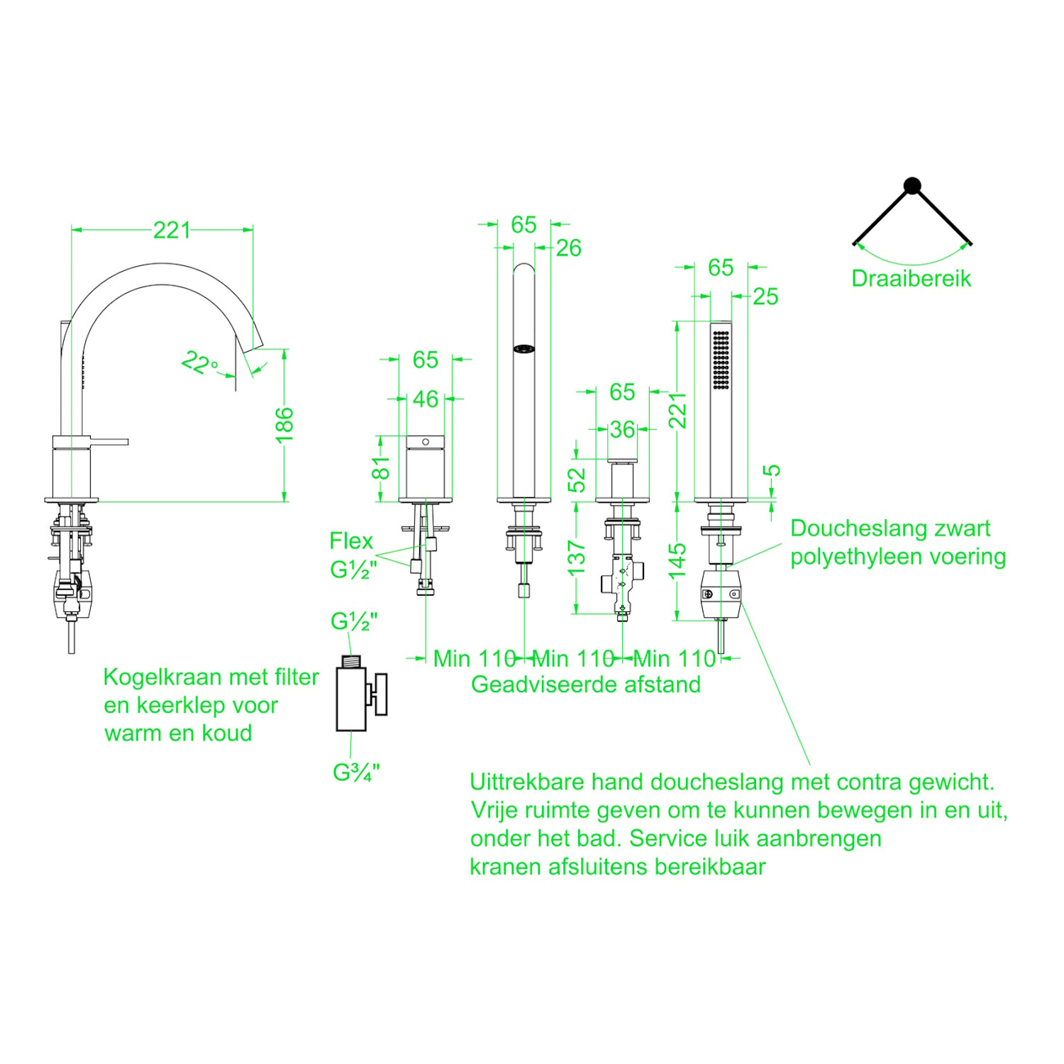 De mengkraan heeft een hoogte van 8,1 cm en een breedte van 4,6 cm. De omstelkraan heeft een hoogte van 5,2 cm en een breedte van 3,6 cm. De handdouche heeft een hoogte van 22,1 cm en een breedte van 2,5 cm. De kraan heeft een breedte van 2,6 cm. De lengte van de uitloop van de kraan is 22,1 cm. De minimale geadviseerde afstand tussen de kranen is 11 cm.