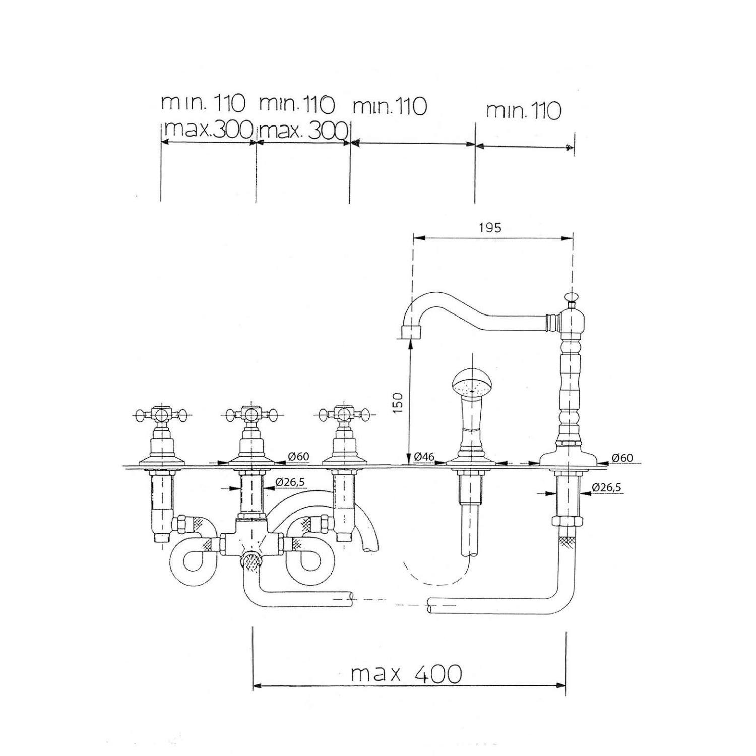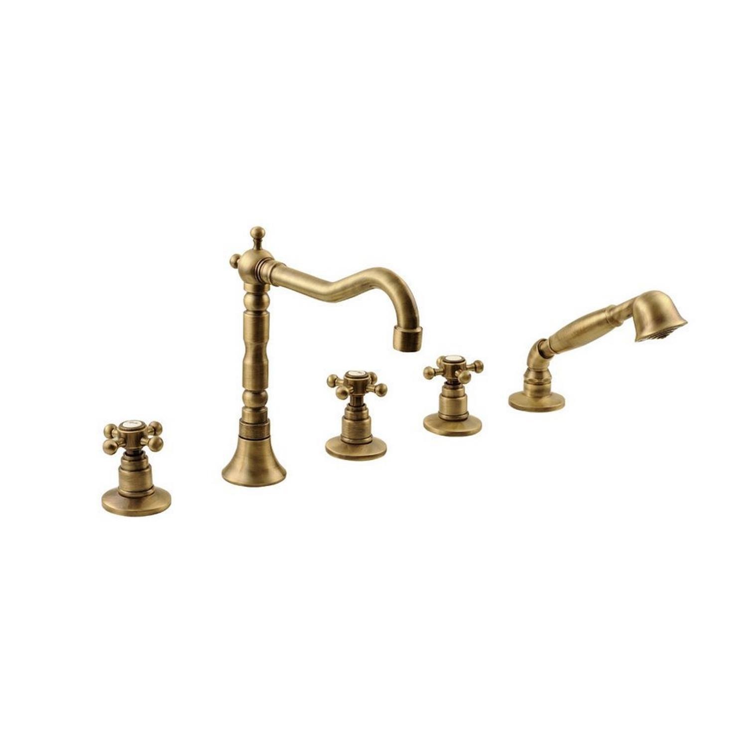 De bronzen kraan is een mengkraan voorzien van 5 elementen, ook wel 5-gats genoemd. U ziet de kraan, de handdouche en 3 kruisgrepen. Alle 3 de kruisgrepen hebben een andere functie. Warm en koud water bedienen, de uitloop van het water regelen (handdouche of kraan) en de kraan aan of uit zetten.