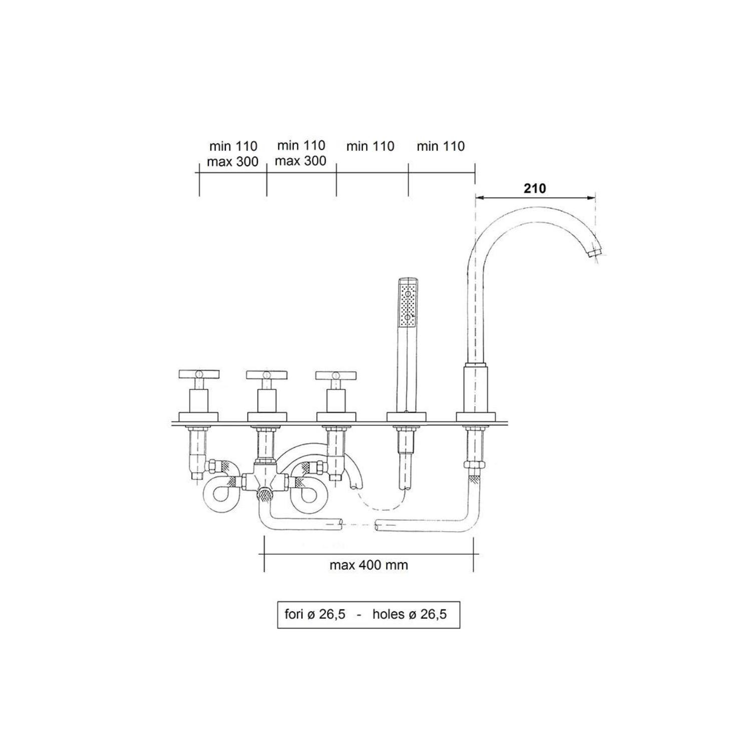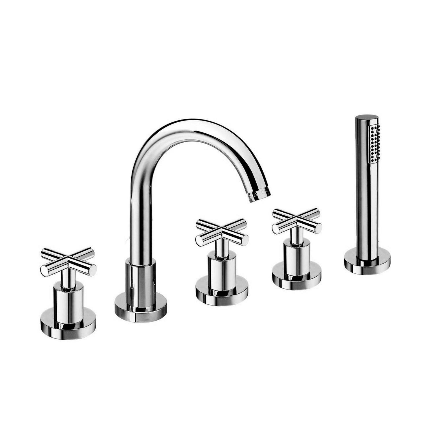 De chromen kraan is een mengkraan voorzien van 5 elementen, ook wel 5-gats genoemd. U ziet de kraan, de handdouche en 3 kruisgrepen. Alle 3 de kruisgrepen hebben een andere functie. Warm en koud water bedienen, de uitloop van het water regelen (handdouche of kraan) en de kraan aan of uit zetten.
