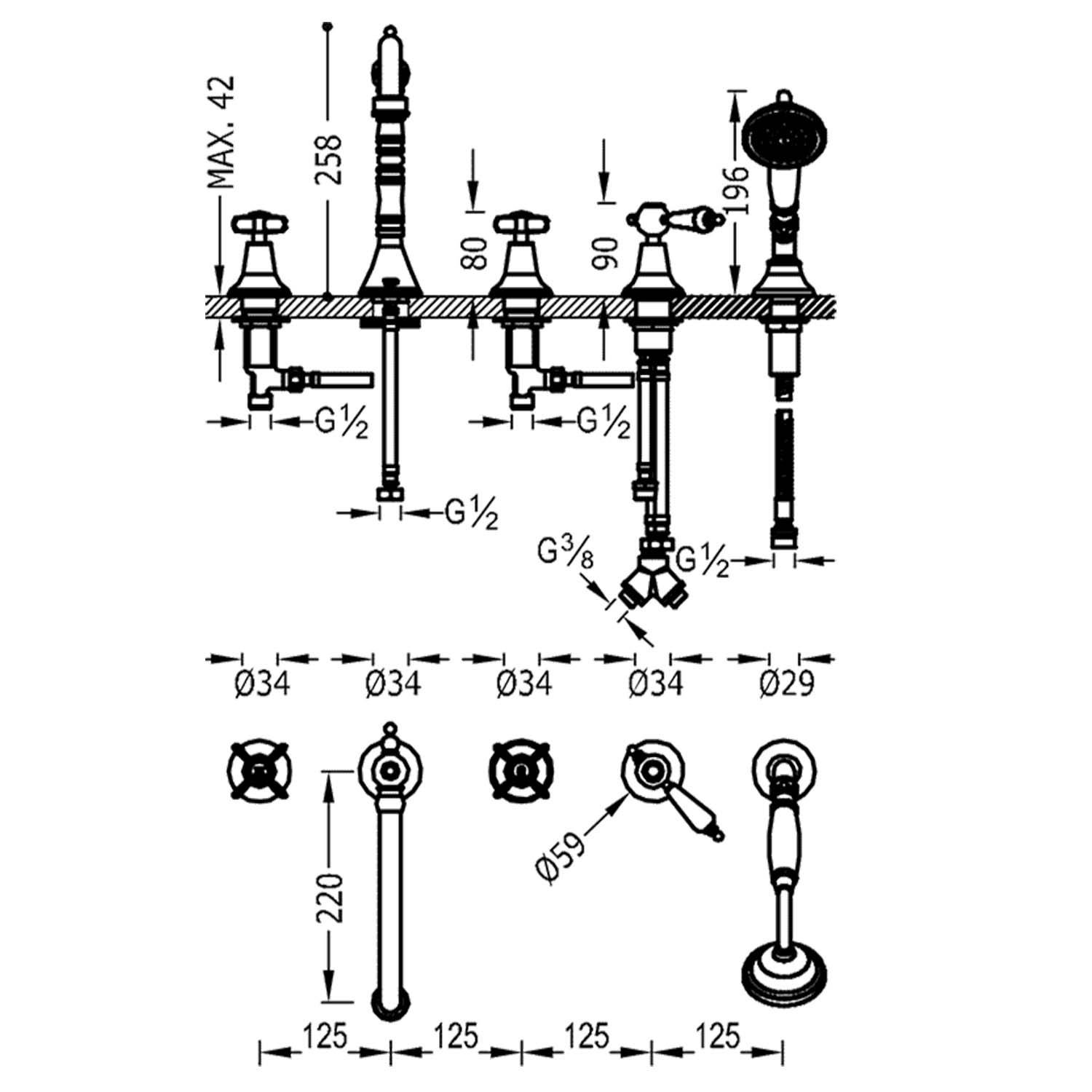 De mooie klassieke afbouwset is een 5-gats badmengkraan. Deze bevat twee kruisgrepen waarmee de temperatuur geregeld kan worden. De kraan heeft een uitloop van 22 cm en de handdouche is voorzien van antikalk sproeigaatjes waardoor deze makkelijk schoon te maken is.