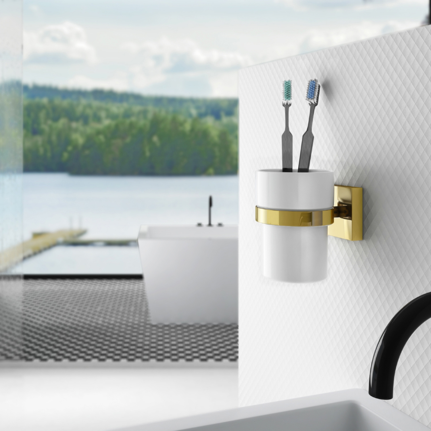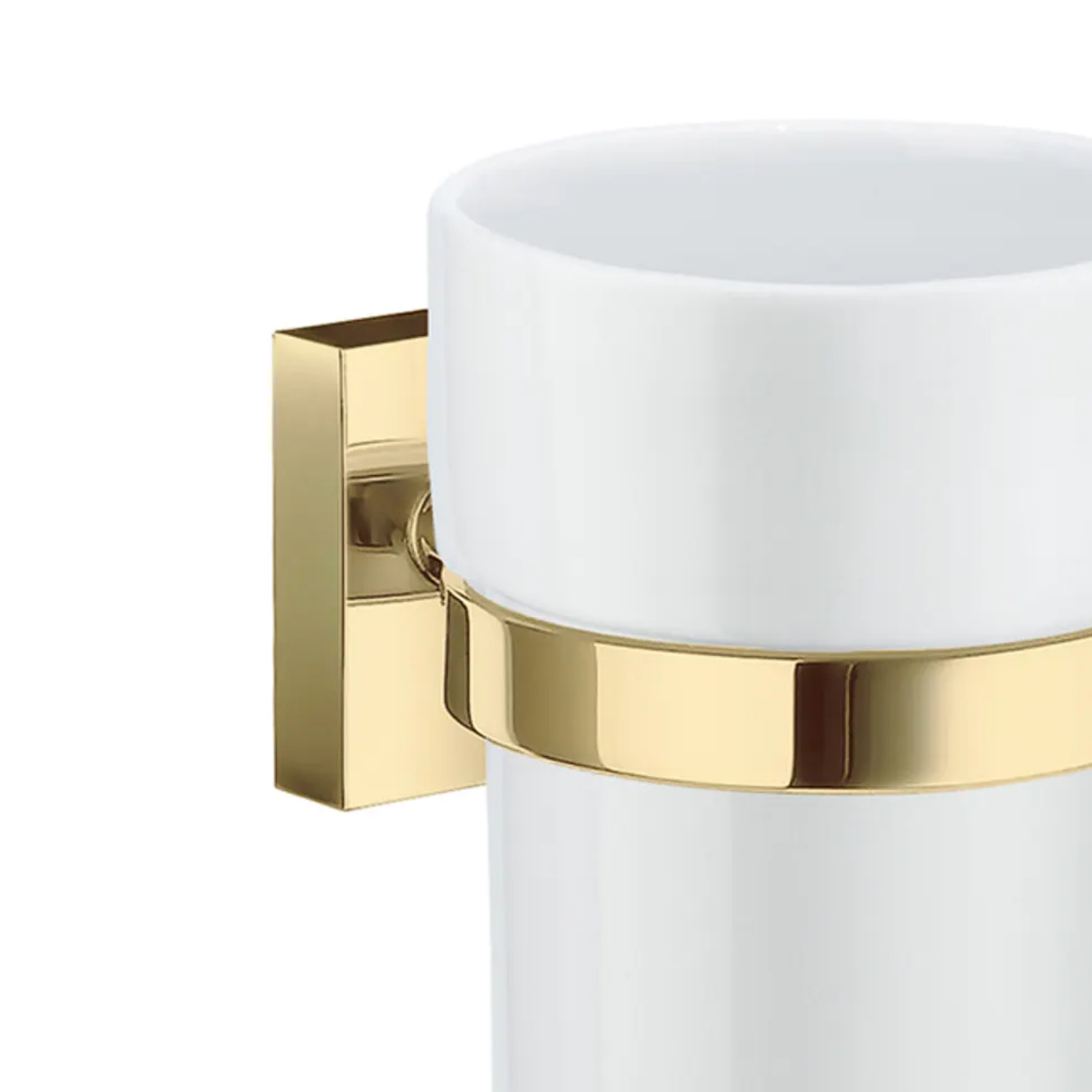 De combinatie van gepolijste messing en porselein maakt deze bekerhouder een tijdloos item voor aan de wand. De met messing afgewerkte bekerhouder kan bevestigd worden met bijgeleverde schroeven of u kunt kiezen voor een montagelijm oplossing (niet bijgeleverd).