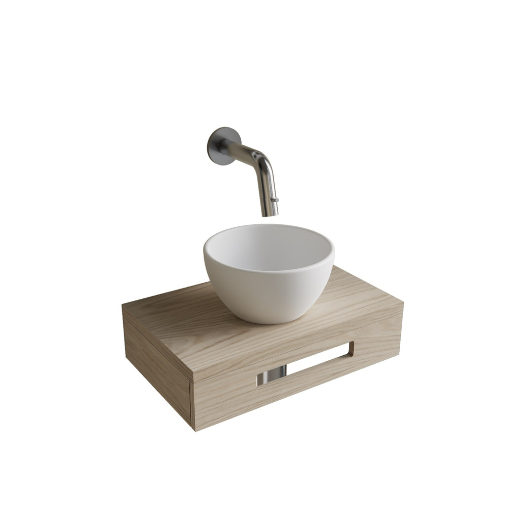 Bij deze set is in begrepen een Solid Surface Waskom, een duurzame en stijlvolle waskom in elegante witte kleur en met een afmeting van 21 cm breed en 11 cm hoog. Een prachtige fonteinplank in een eiken kleur voorzien van een handige uitsparing aan de voorkant voor het ophangen van handdoeken. De plank is 40 cm breed en 25 cm diep. Bovendien zijn ook inbegrepen de Chroom Accessoires; een chrome fonteinkraan met een aansluiting van G1/2,een bijpassende chrome plug en een chrome sifon.
