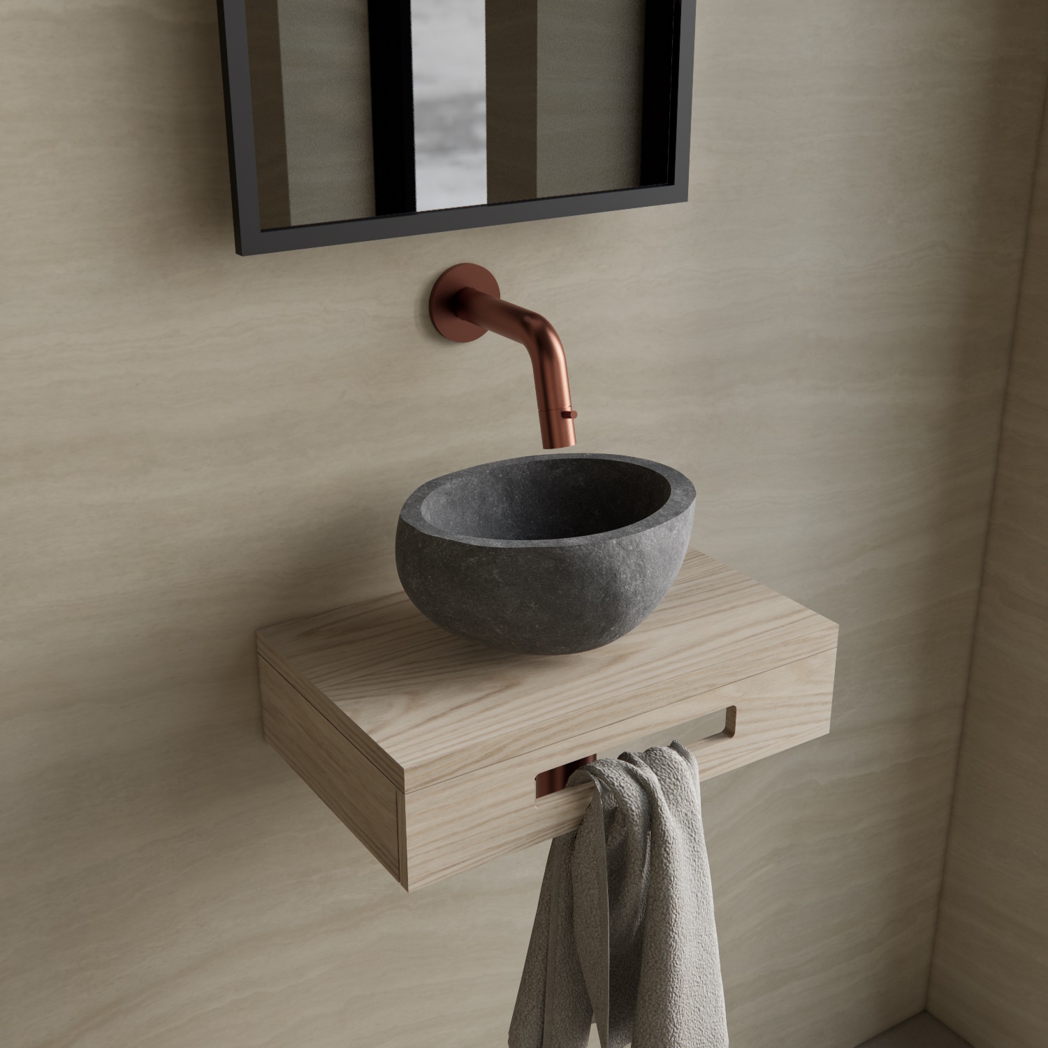 Bij deze set is in begrepen een Natuursteen Waskom, een duurzame en stijlvolle waskom in elegante grijze kleur en met een afmeting van 25 cm breed en 15 cm hoog. Een prachtige fonteinplank in een eiken kleur voorzien van een handige uitsparing aan de voorkant voor het ophangen van handdoeken. De plank is 40 cm breed en 25 cm diep. Bovendien zijn ook inbegrepen de koperen Accessoires; een mat koperen fonteinkraan met een aansluiting van G1/2,een bijpassende koperen plug en een koperen sifon.