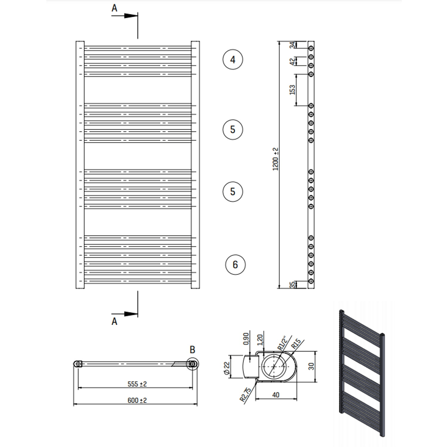 De radiator heeft een hoogte van 120 cm en een breedte van 60 cm. De radiator beschikt over een midden aansluiting. Wilt u weten hoeveel wattage u nodig heeft voor in uw badkamer? Er is een simpele rekensom die uit kunt gebruiken. Bereken eerst de inhoud (m3) van de ruimte. Vervolgens bepaalt u de gewenste temperatuur. Zie de afbeelding voor meer details.