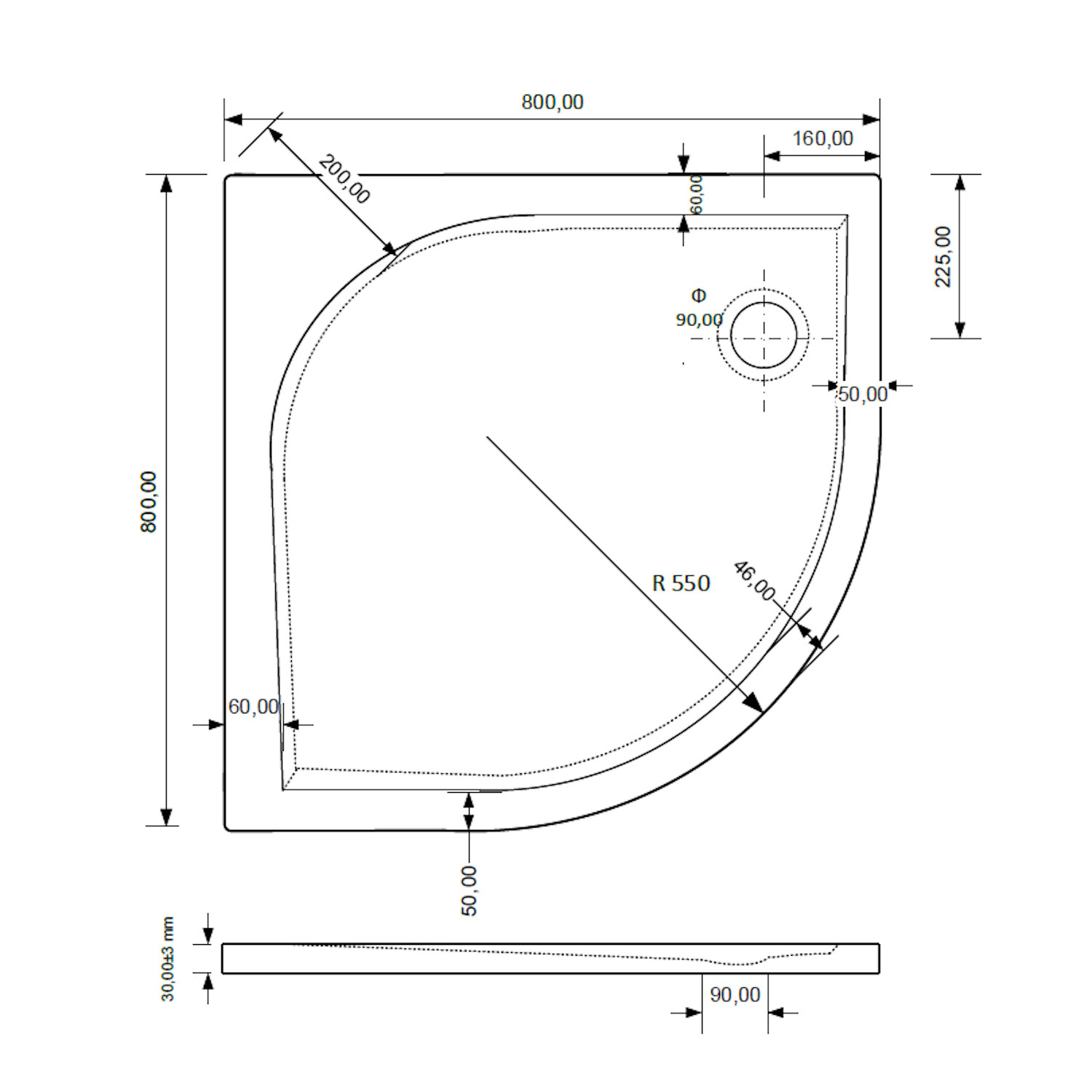 De douchebak heeft een kwartronde vorm, is gemaakt van het materiaal cast marble en is verkrijgbaar in verschillende afmetingen: