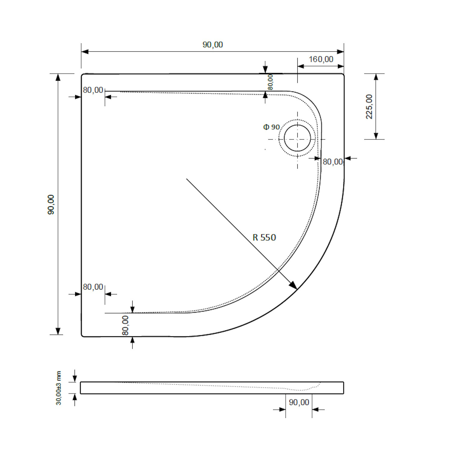 De douchebak heeft een kwartronde vorm, is gemaakt van het materiaal cast marble en is verkrijgbaar in verschillende afmetingen: