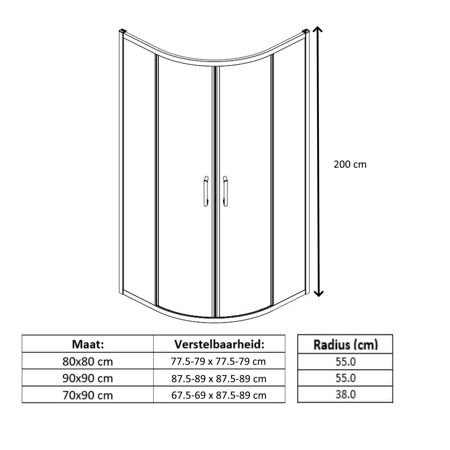 De Vulcano Evo douchecabine van het merk Lacus is een kwartronde cabine die leverbaar is in drie verschillende afmetingen. De douchecabine bestaat uit twee schuifdeuren die samen een mooi geheel vormen. Beide deuren beschikken over een verstelbaarheid van 1.5 cm. U dient eerst een maat te selecteren om vervolgens op de technische tekening te zien welke verstelbaarheid hoort bij de door u gekozen variant.