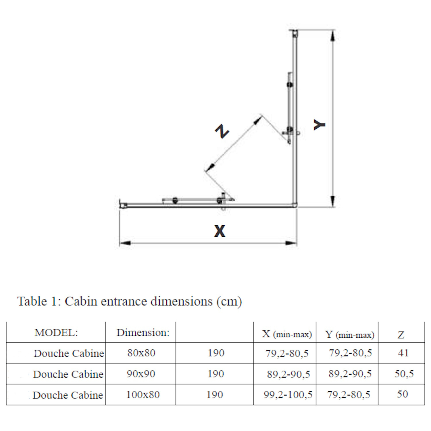 De douchecabine is 190 cm hoog en 100/80 cm breed