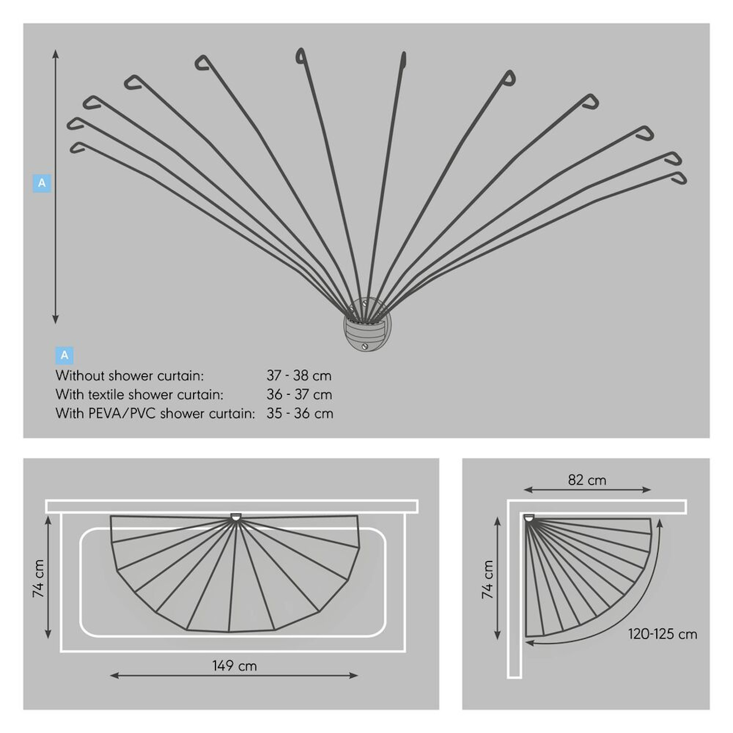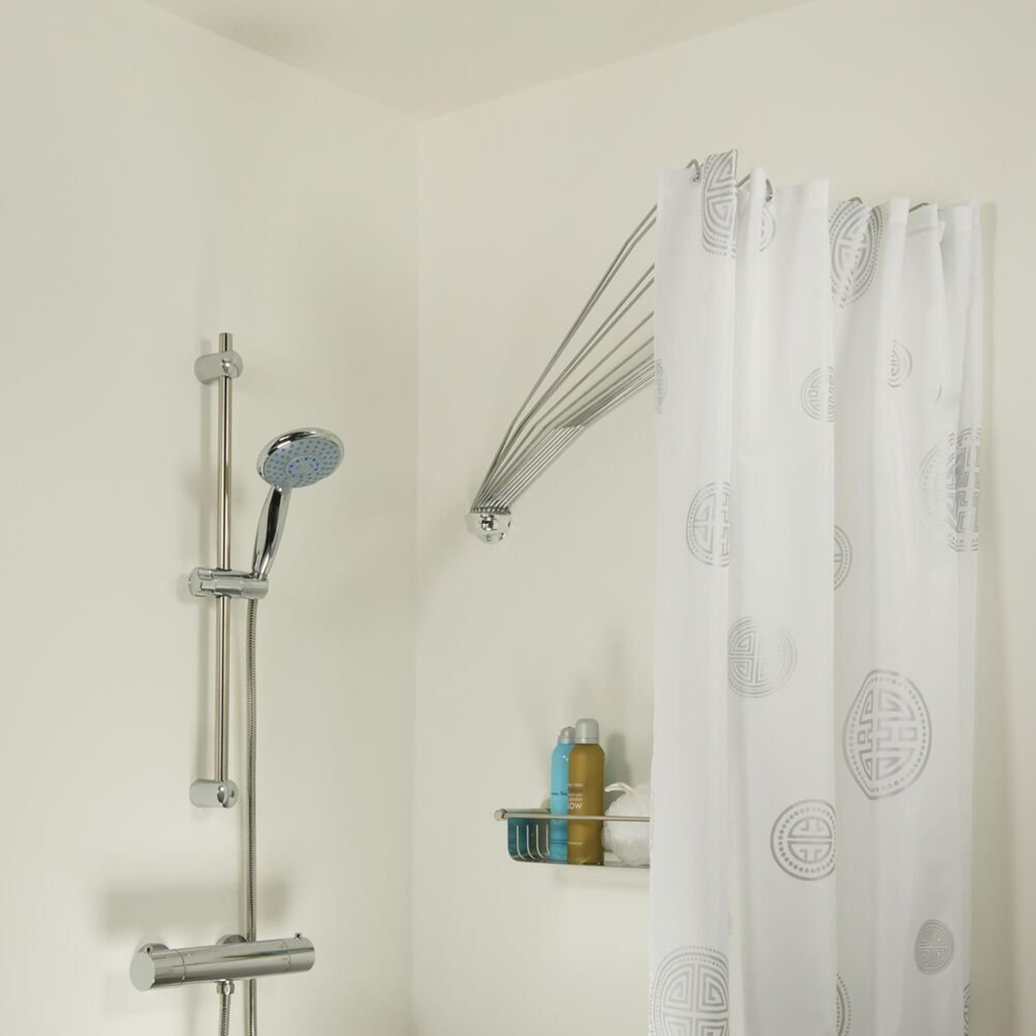 Deze Umbrella douchegordijnstangset is de ideale oplossing voor de kleinere badkamer. De set bestaat uit een paraplu systeem waar u uw douchegordijn aan hangt. U kunt uw douchegordijn gemakkelijk heen en weer schuiven. Het systeem is geschikt voor verschillende doucheruimtes, een hoek, tegen de muur, of in combinatie met een bad, het is allemaal mogelijk! De 12 steunen kunnen zich spreiden over een maximale breedte van 155 cm.