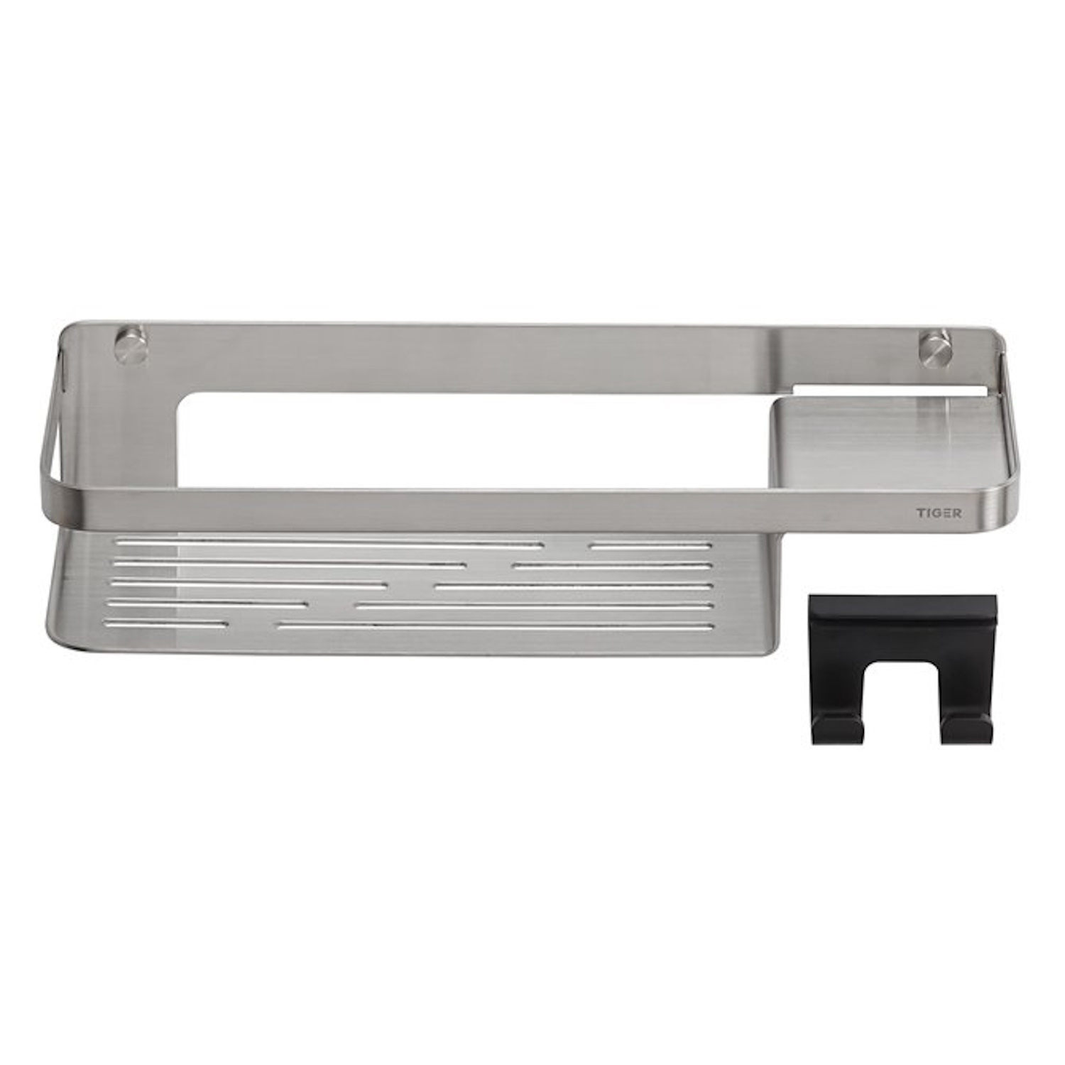 Zorg voor extra ruimte in uw doucheruimte met de Tiger Caddy douchemand. Dankzij het 2-in-1 design is deze douchemand extra handig. Naast ruimte voor uw zeepproducten, bevat de mand namelijk ook een haakje om bijvoorbeeld uw scheermes aan op te hangen. De douchemand heeft een luxe uitstraling en de zwarte haak is verstelbaar. Dankzij de gleuven in de douchemand zal het water met gemak weglopen.