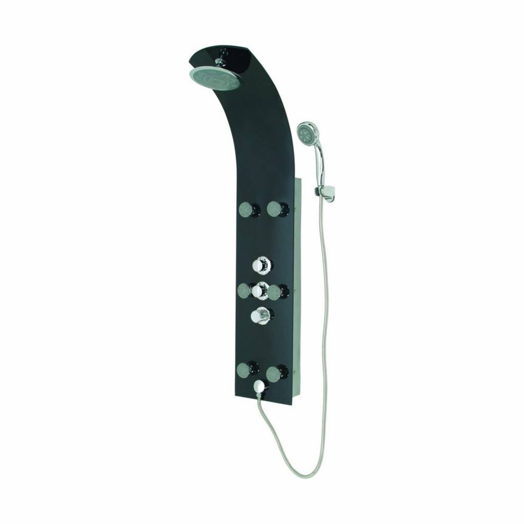 Dit douchepaneel van het merk Schütte behoort tot de serie Lanzarote. Het douchepaneel is gemaakt van glas en is afgewerkt in een zwarte kleur. Het paneel beschikt over een thermostatische douchekraan met een kinderbeveiliging vanaf 38°C. Bovenin bevindt zich de ronde stortdouche met een diameter van 20 cm, terwijl het paneel ook is voorzien van een kleine handdouche. Met de omstelknop is het eenvoudig te bepalen van welke douche gebruik wordt gemaakt.