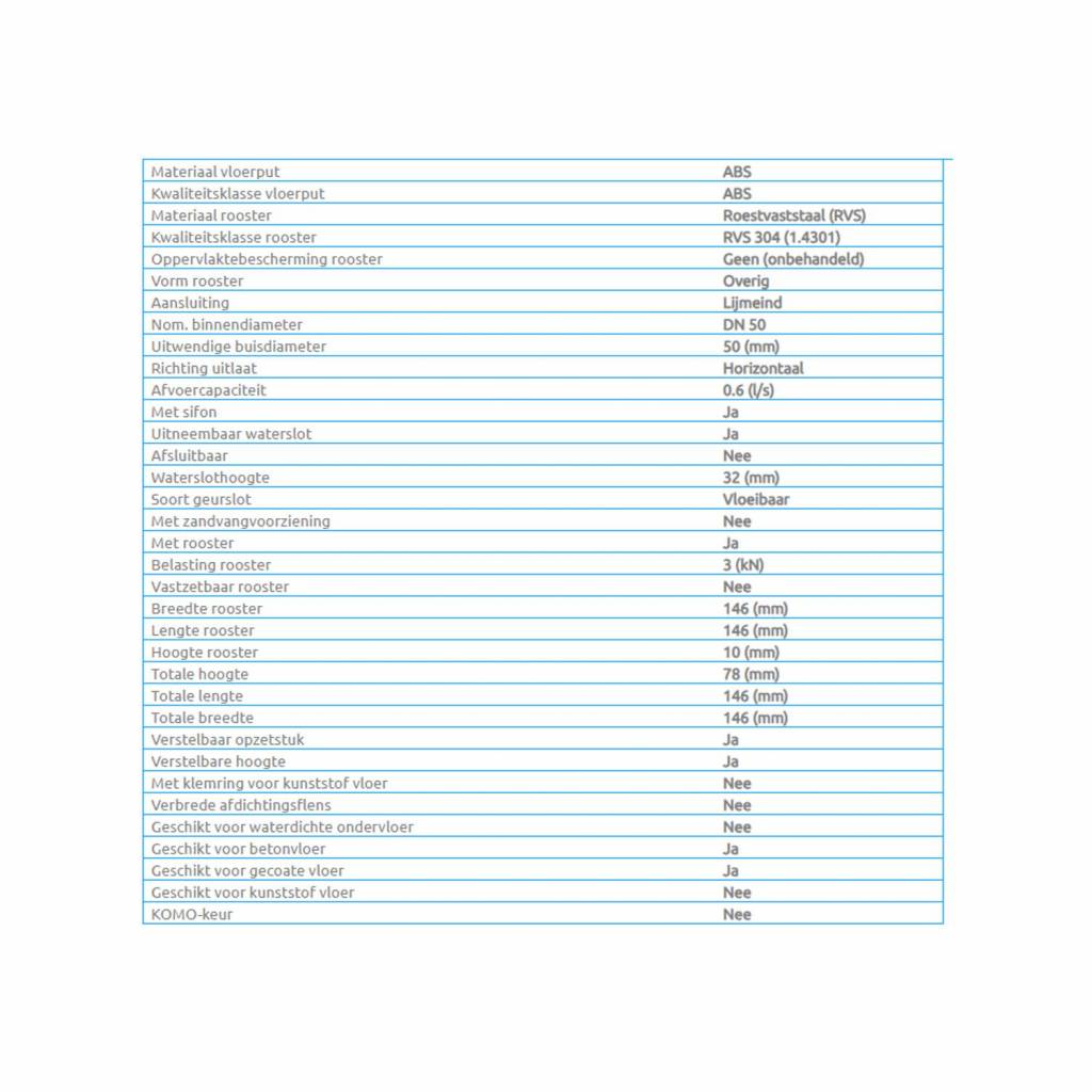 Doucheput Aquaberg ABS Vloerput ABS Opzetstuk RVS Sierrand Zijuitlaat 50mm Verstelbaar 146x146mm PPC Reukafsluiter