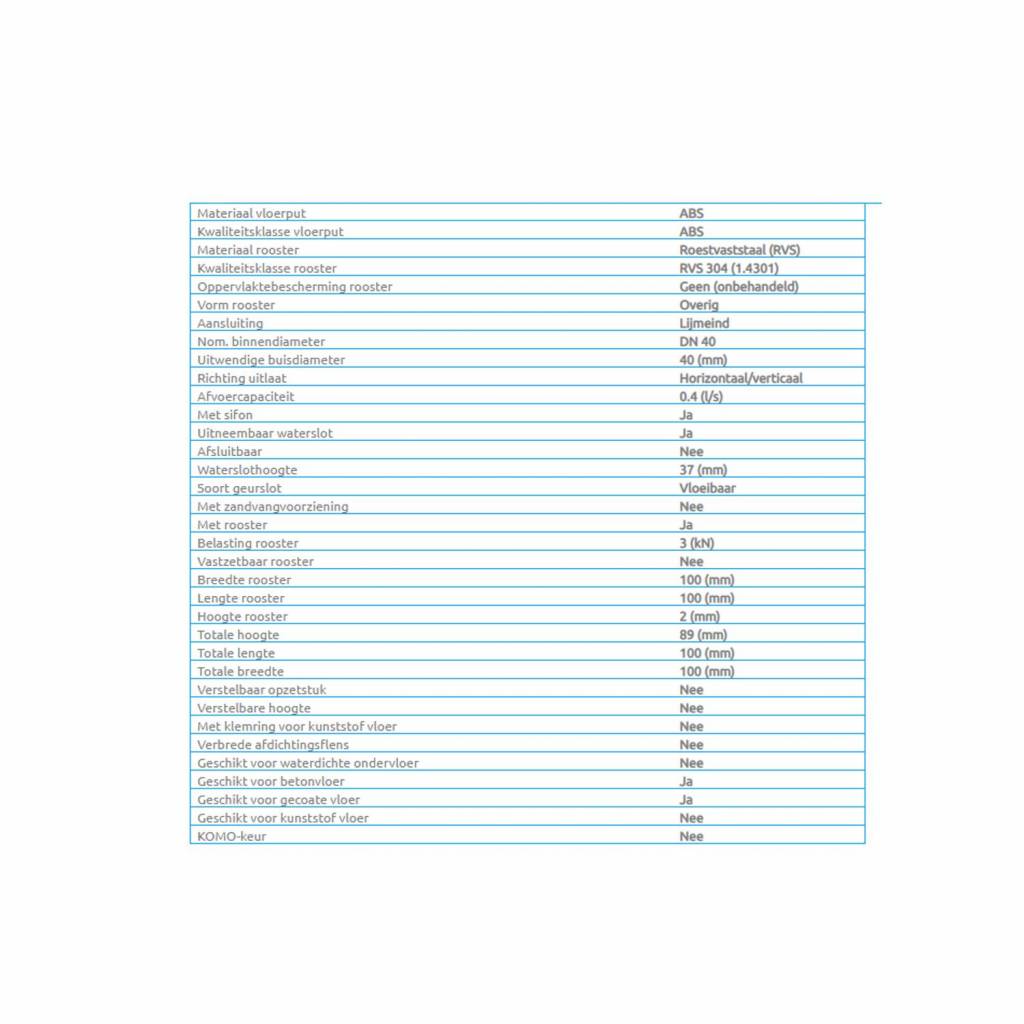 Aquaberg ABS vloerput m. RVS rooster m. onderuitl. Ø50mm en zijuitl. Ø40mm 100x100mm m. PPC reukafsluiter, reukslot 37mm 4240