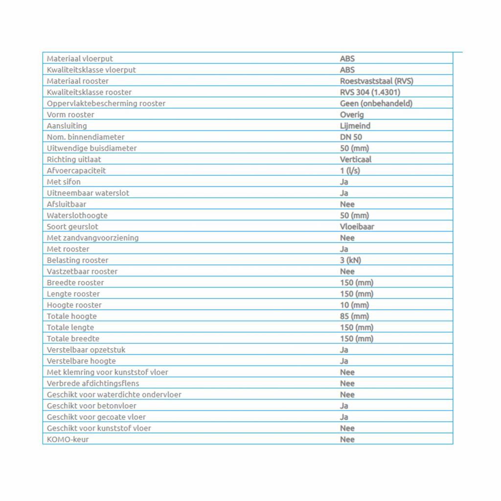 Doucheput Aquaberg ABS Vloerput RVS Opzetstuk RVS Rooster Onderuitlaat 50mm 150x150mm PPC Reukafsluiter