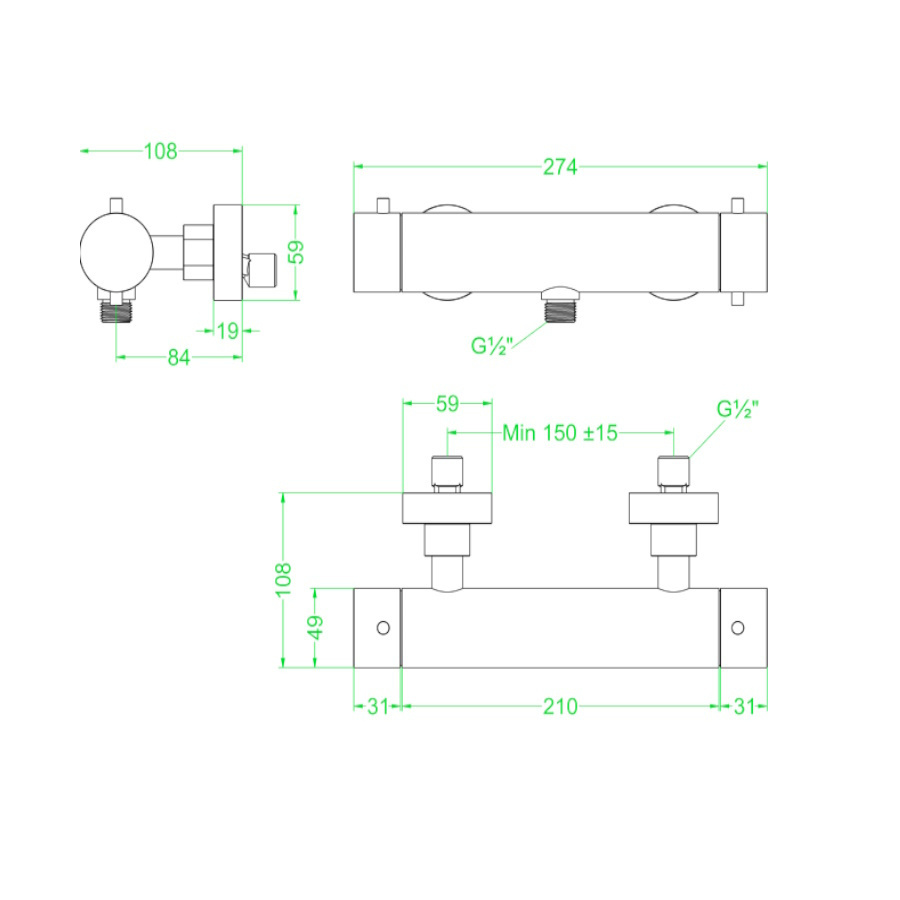 De douchethermostaatkraan heeft een breedte van 27,4 cm en een diepte van 10,8 cm. De kraan heeft hoogte van 5,9 cm en een HOH-maat van 15 cm - 16,5 cm. De maat van de draadaansluiting is 1/2 inch.