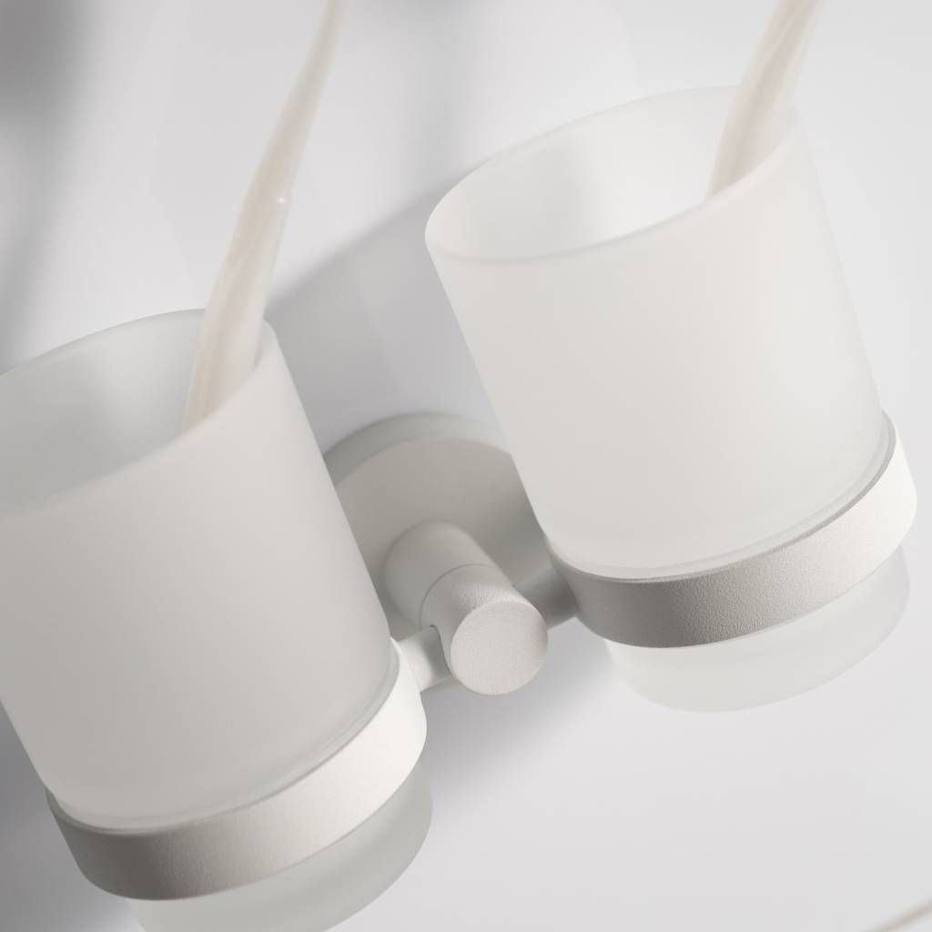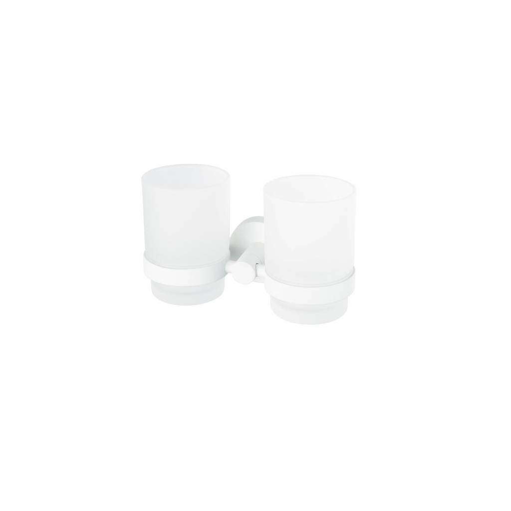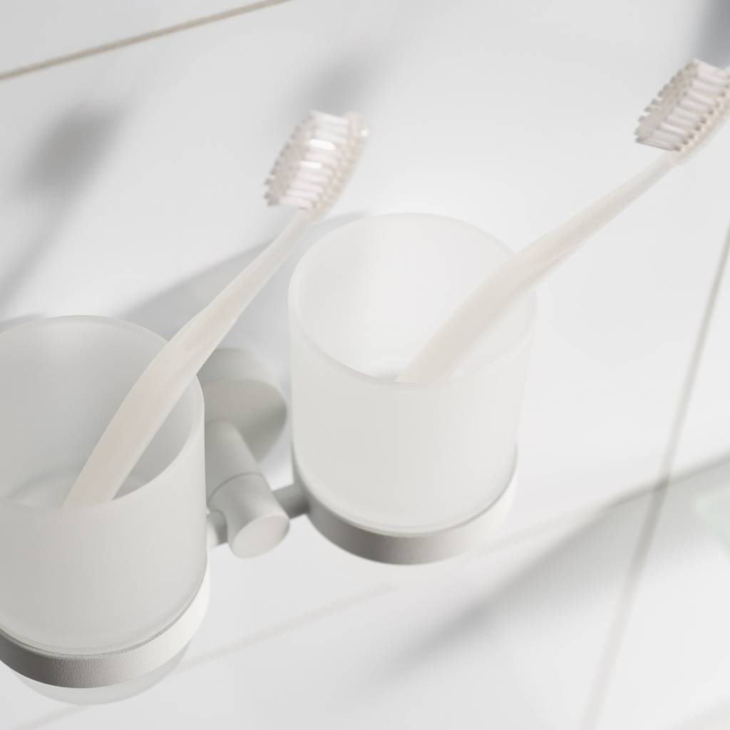 Wel zo makkelijk: deze dubbele glashouder van mat glas. Eén voor uw tandenborstel, één om uit te drinken. Of gewoon: ieder een eigen glas. De bekers zijn makkelijk uitneembaar en gemaakt van mat glas.