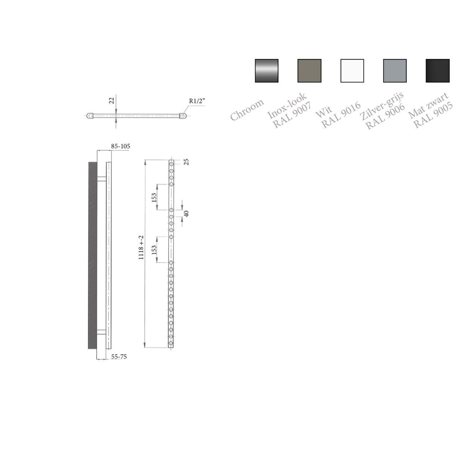 De radiator wordt geleverd inclusief ophanging, automatische ontluchter, 4 montage beugels en thermostaat. (de locatie van de thermostaat is rechtsonder, op aanvraag ook linksonder leverbaar). De afmeting van de radiator is 111,8 cm hoog, 45 cm breed en hij wordt geleverd in de kleur Inox Look met thermostaat zwart.