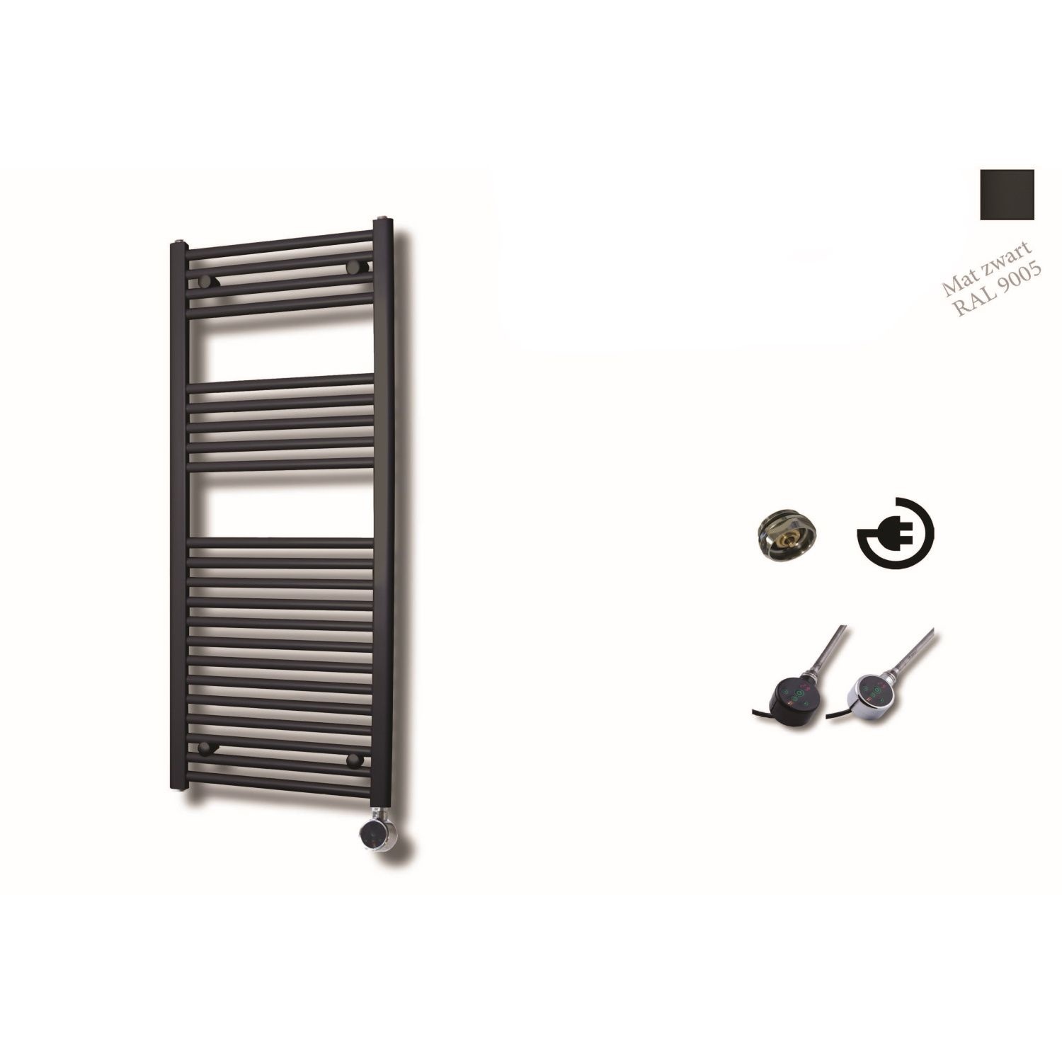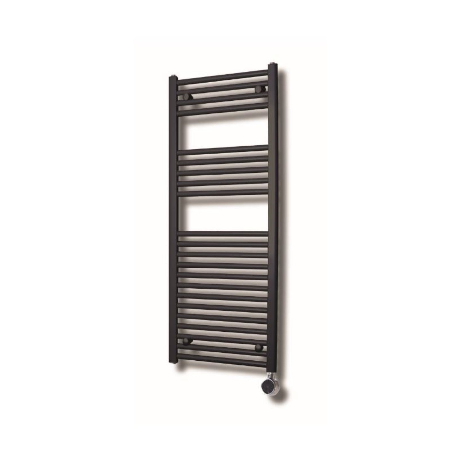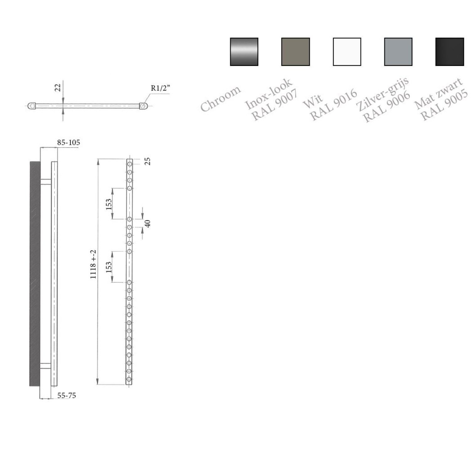 De radiator wordt geleverd inclusief ophanging, automatische ontluchter, 4 montage beugels en thermostaat. (de locatie van de thermostaat is rechtsonder, op aanvraag ook linksonder leverbaar). De afmeting van de radiator is 111,8 cm hoog, 45 cm breed en hij wordt geleverd in de kleur mat zwart met een zwarte thermostaat.