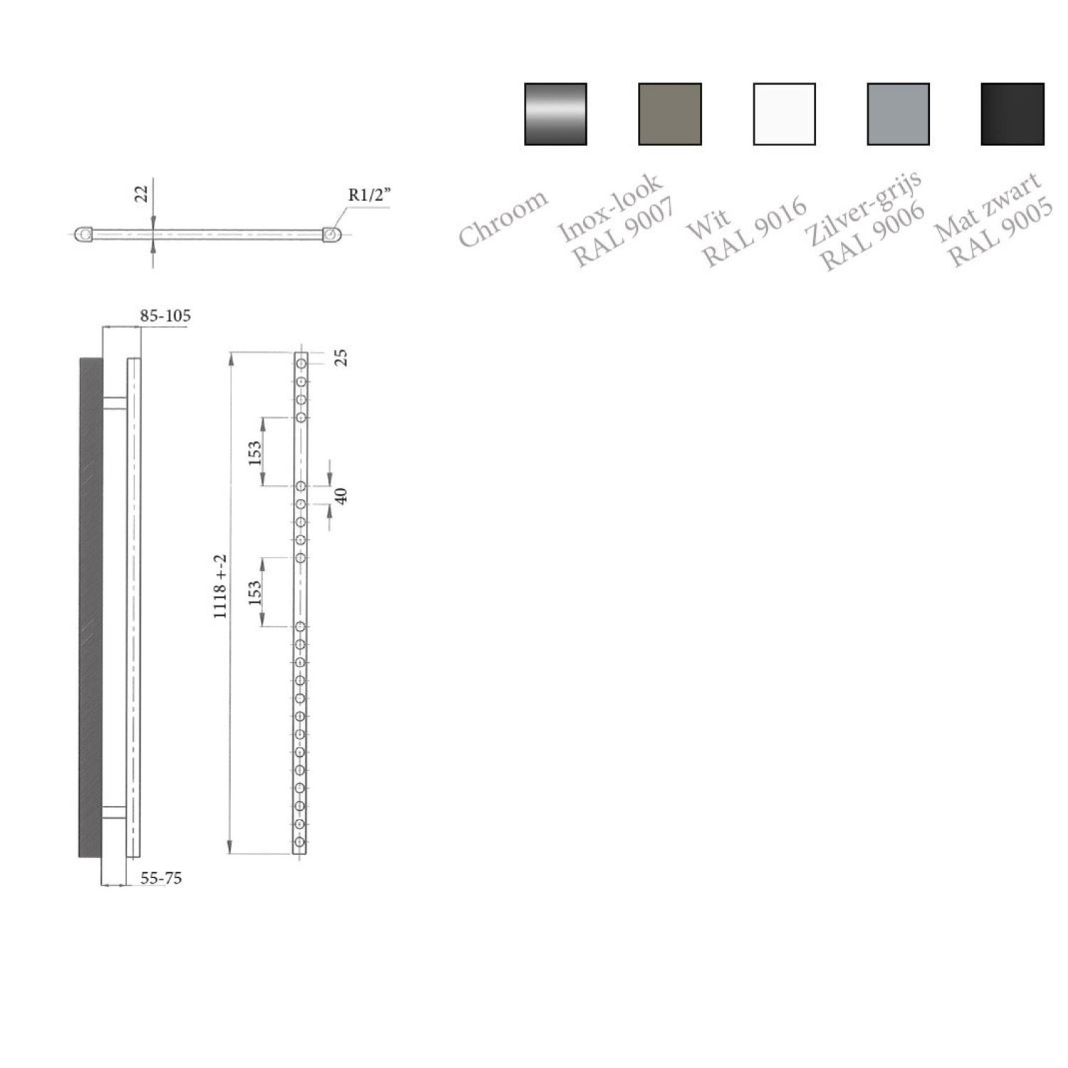 De radiator wordt geleverd inclusief ophanging, automatische ontluchter, 4 montage beugels en thermostaat. (de locatie van de thermostaat is rechtsonder, op aanvraag ook linksonder leverbaar). De afmeting van de radiator is 111,8 cm hoog, 60 cm breed en hij wordt geleverd in chroom, met een chroom kleurige thermostaat.