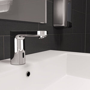Deze moderne wastafelkraan komt uit de Vernis Blend collectie van HansGrohe. De kraan heeft een elektronische bediening door middel van Sensor Activation. De sensor op deze contactloze mengkraan reageert, net als veel bewegingsmelders, op veranderde infraroodstraling. Zodra de sensor de warmte van uw handen detecteert zal het water stromen. Dit maakt de kraan zuinig in verbruik en hygiënisch. Hoelang de kraan spoelt kunt u zelf instellen voor 10, 20 of 30 seconden. De kraan geeft een normale straal en bevat een verstelbare perlator. De kraan is voor koud water of geconcditioneerd water. Daarnaast bevat de kraan een waterstop, zodat u uw wastafel kunt reinigen zonder dat de sensor afgaat.