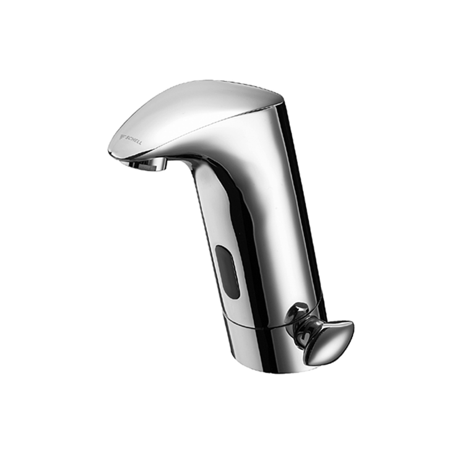De Venus HD-M wastafelmengkraan is van het merk Schell en kent een elektronische uitvoering. Met behulp van de infrarood-sensor die zich in de kraan bevindt schakelt u deze eenvoudig aan. De mengkraan is gemaakt van messing en is afgewerkt in een glanzend chromen kleur. De wastafelkraan is een standaard model en heeft een hoogte van 16,7 cm. De diameter van het kraangat bedraagt 33 mm: houd hier dus rekening mee bij het monteren van de kraan op een wastafel. De kraan werkt op basis van een inbouwtransformator die standaard wordt meegeleverd.