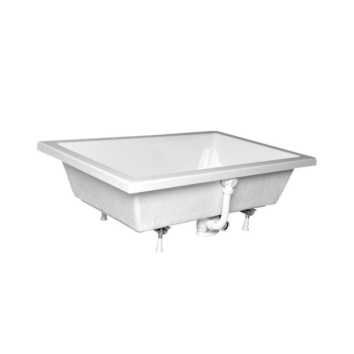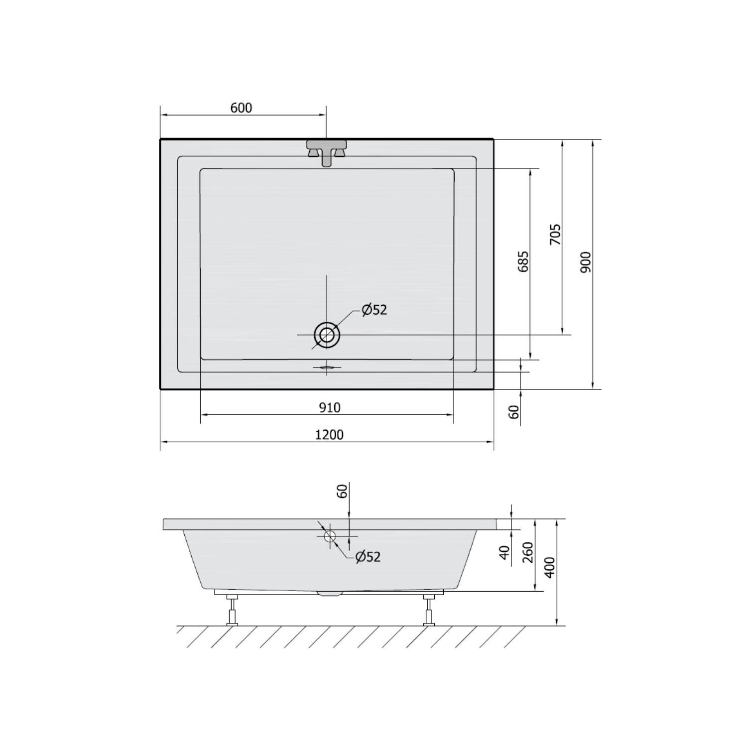 De rechthoekige douchebak is voorzien van een afvoergat met een diameter van 52 mm in het midden van de douchebak. Er wordt geen afvoer meegeleverd en ook de universele potenset zult u moeten bestellen. De voeten zijn niet inbegrepen in het pakket