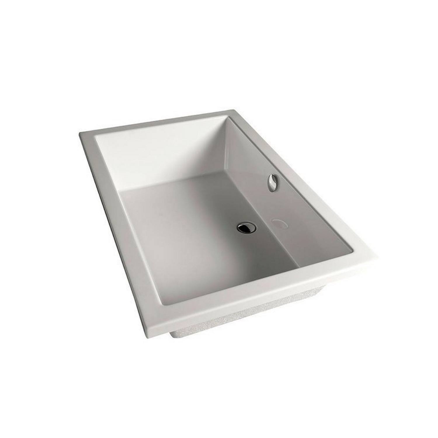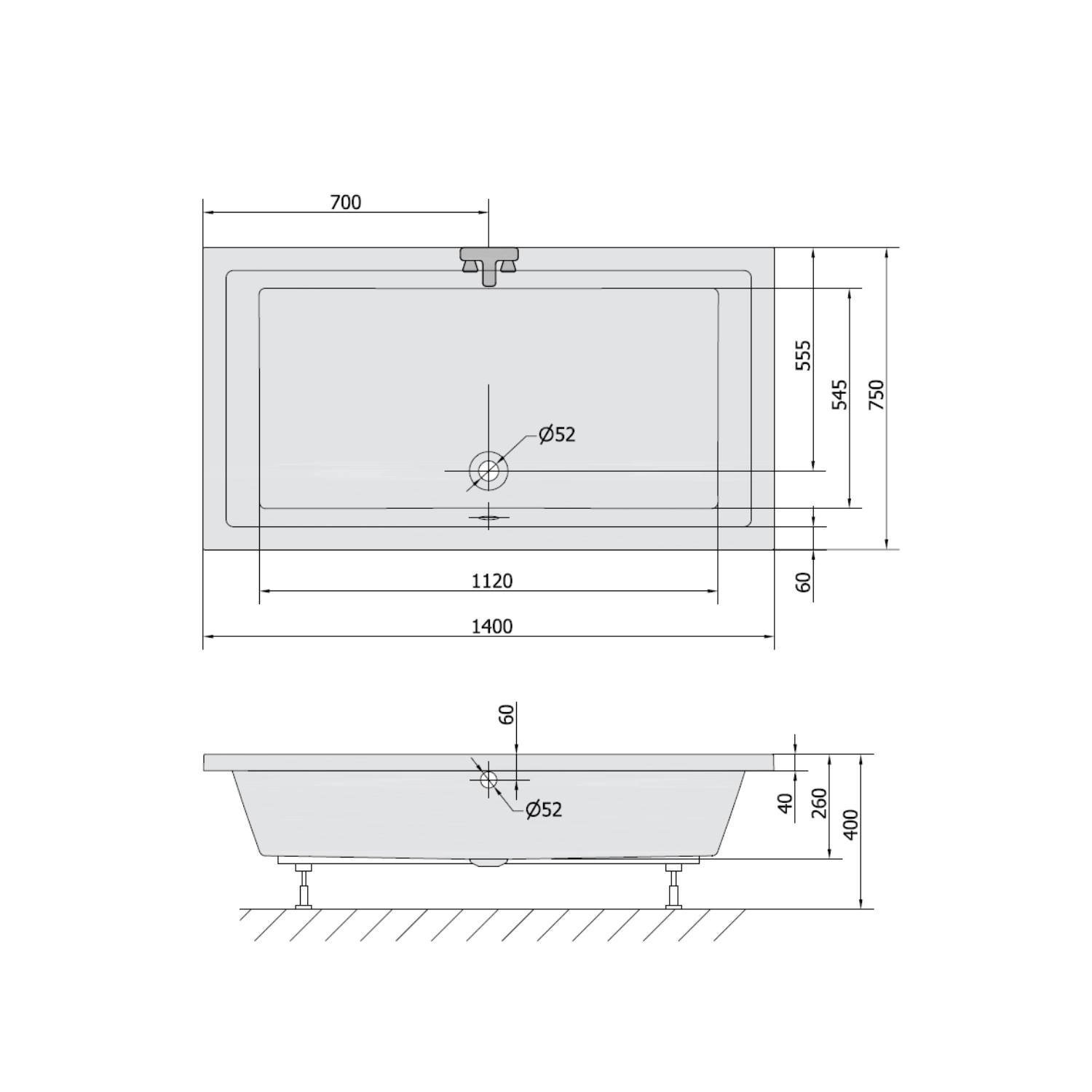 De rechthoekige douchebak is voorzien van een afvoergat met een diameter van 52 mm in het midden van de douchebak. Er wordt geen afvoer meegeleverd en ook de universele potenset zult u moeten bestellen. De voeten zijn niet inbegrepen in het pakket