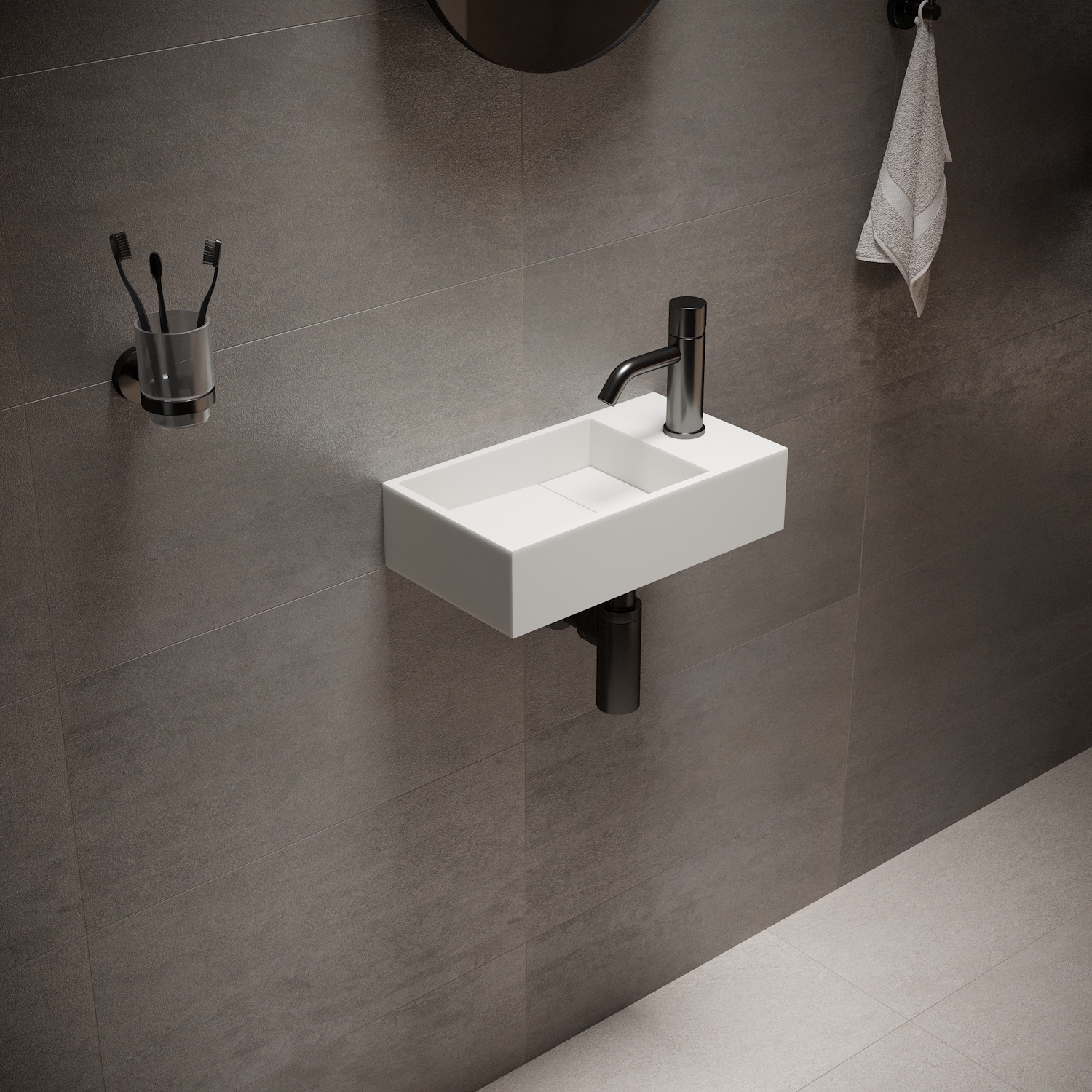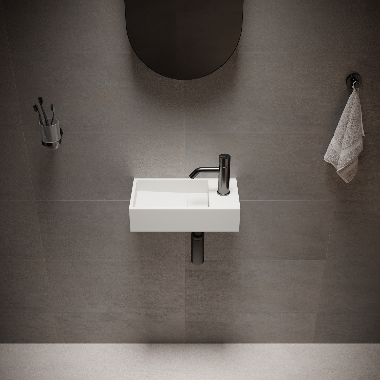 Solid Surface is uitstekend geschikt om sanitaire producten van te maken omdat het geen poriën en naden heeft. Solid Surface is een composiet, geproduceerd uit mineralen en harsen. Bovendien is dit materiaal bestendig tegen vocht, vlekken, en zelfs chemische stoffen. Er trekt dus niets in, is niet poreus en heeft een intense kleur en is gemakkelijk schoon te houden. Omdat het door en door van hetzelfde materiaal bestaat, kunnen eventuele beschadigingen weg gepolijst worden. Perfect om de hygiëne te behouden in uw design badkamer of toilet.
