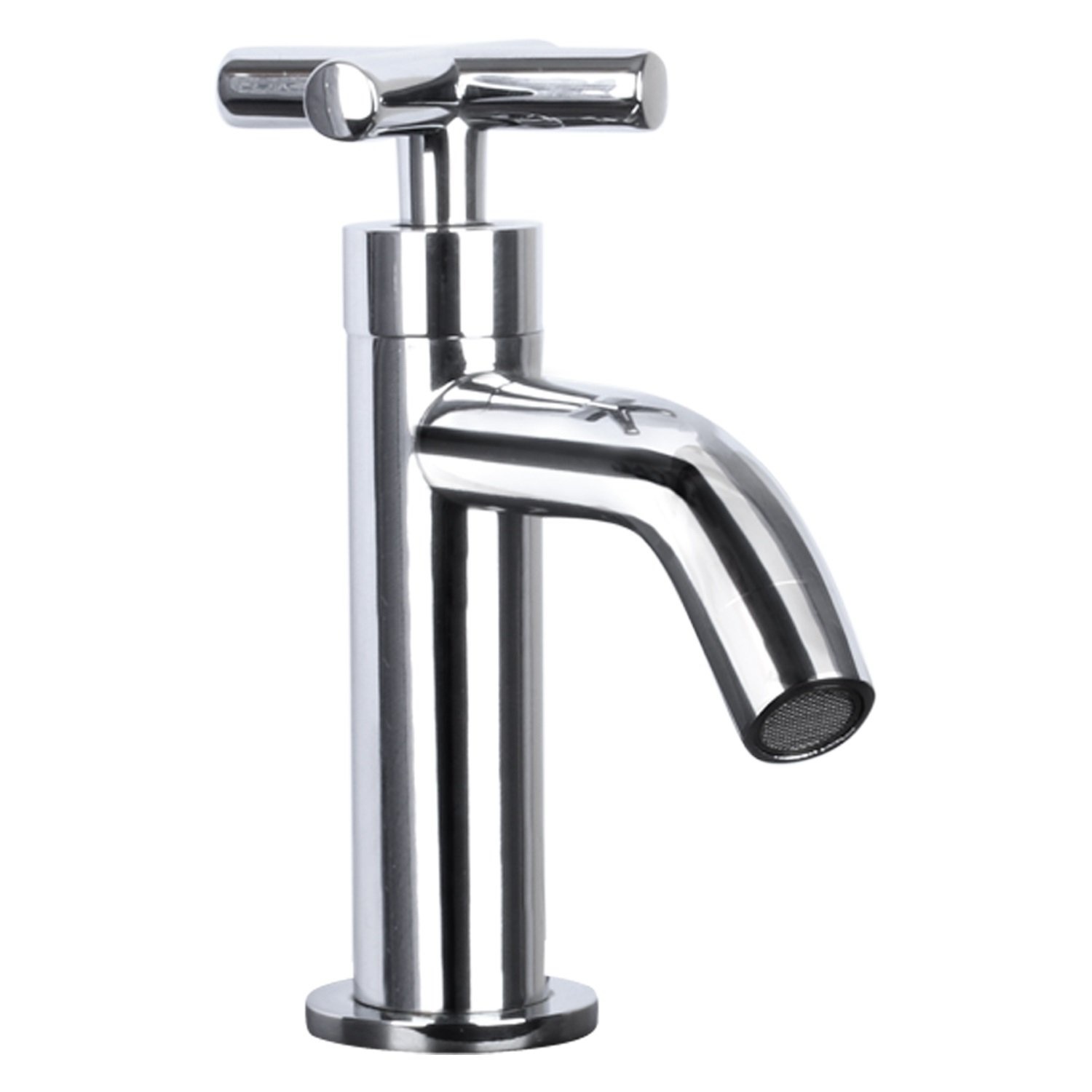 Stoere fonteinkraan met industriële uitstraling. Met zijn compacte afmetingen van 14.5 x 3 cm past deze kraan in elk toilet. Ondanks de afmetingen is de kraan erg gebruiksvriendelijk en eenvoudig te gebruiken. Door het kruis bovenop is het ook met natte handen goed te bedienen. De kraan verzorgd enkel koud water.