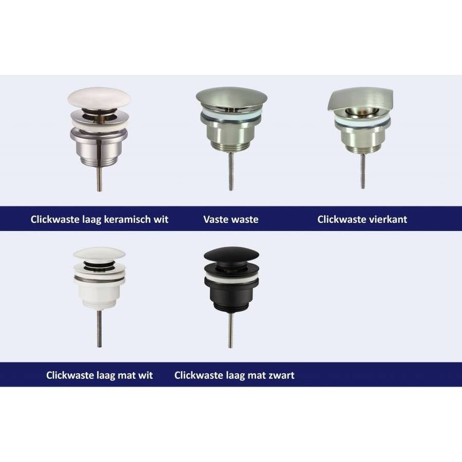 De niet afsluitbare afvoerplug zit standaard bijgeleverd. U heeft de keuze uit een draai of click waste tegen een meerprijs. Wij adviseren we plug i.v.m. overstromingsgevaar als de kraan per ongeluk openblijft staan.