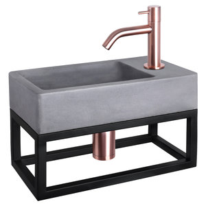 Deze combinatie bestaat uit het stijlvolle donker betonnen fontein Force met rood kopere gebogen koudwaterkraan, afvoerplug en sifon. Het handige bijpassende mat zwarte handdoekrek, waar u bijvoorbeeld uw handdoeken of andere toiletbenodigdheden kunt plaatsen of hangen, maakt de set helemaal af. Het kraangat zit aan de rechterkant van dit stijlvolle fontein. Het betonnen materiaal is zeer stevig en heeft een waterdichte coating. Beton zorgt voor een industriële uitstraling .